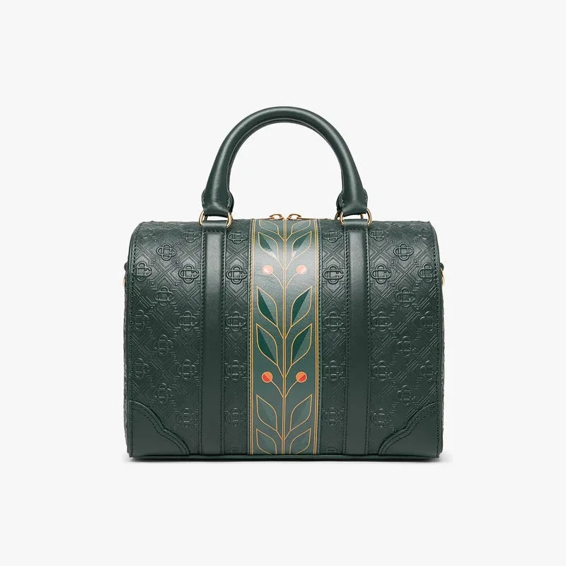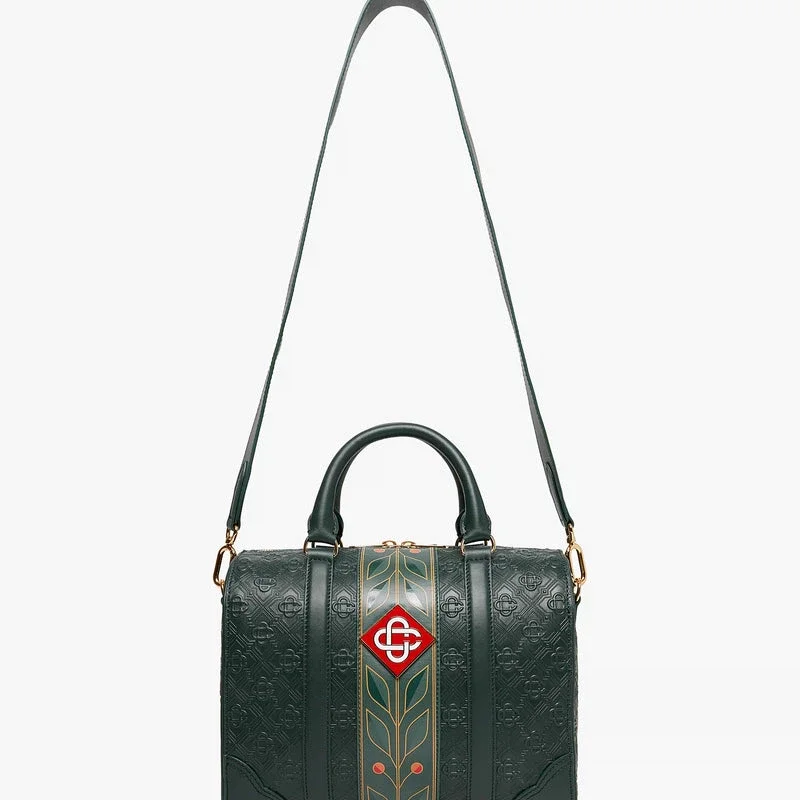 La mini bolsa de fin de semana Monogram verde está confeccionada en piel italiana y adornada con el emblemático logotipo de diamantes de la casa en el lateral. Se completa con el emblemático motivo de laurel de la casa, asas, cierre de cremallera, correa para el hombro, bolsillo interior y herrajes de latón. Se suministra con una caja de regalo con la marca Casablanca, una bolsa protectora y un folleto con los detalles del producto.