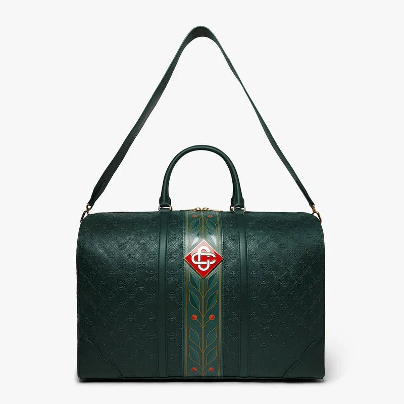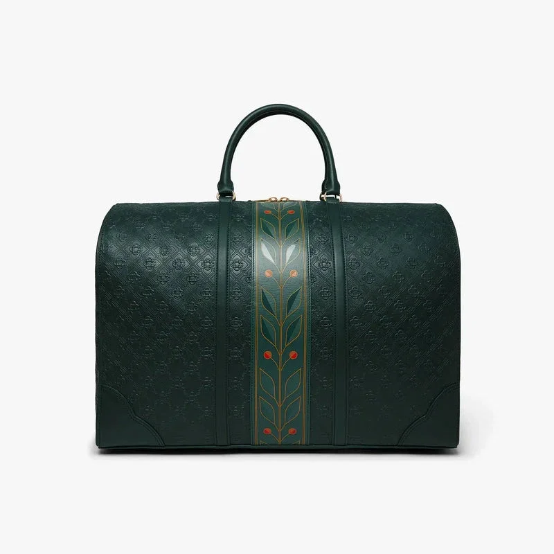 La bolsa de fin de semana Monogram verde está confeccionada en piel italiana y adornada con el emblemático logotipo de diamantes de la casa en el lateral. Se completa con el emblemático motivo de laurel de la casa, asas, cierre de cremallera, correa para el hombro, bolsillo interior y herrajes de latón. Se suministra con una caja de regalo con la marca Casablanca, una bolsa protectora y un folleto con los detalles del producto.