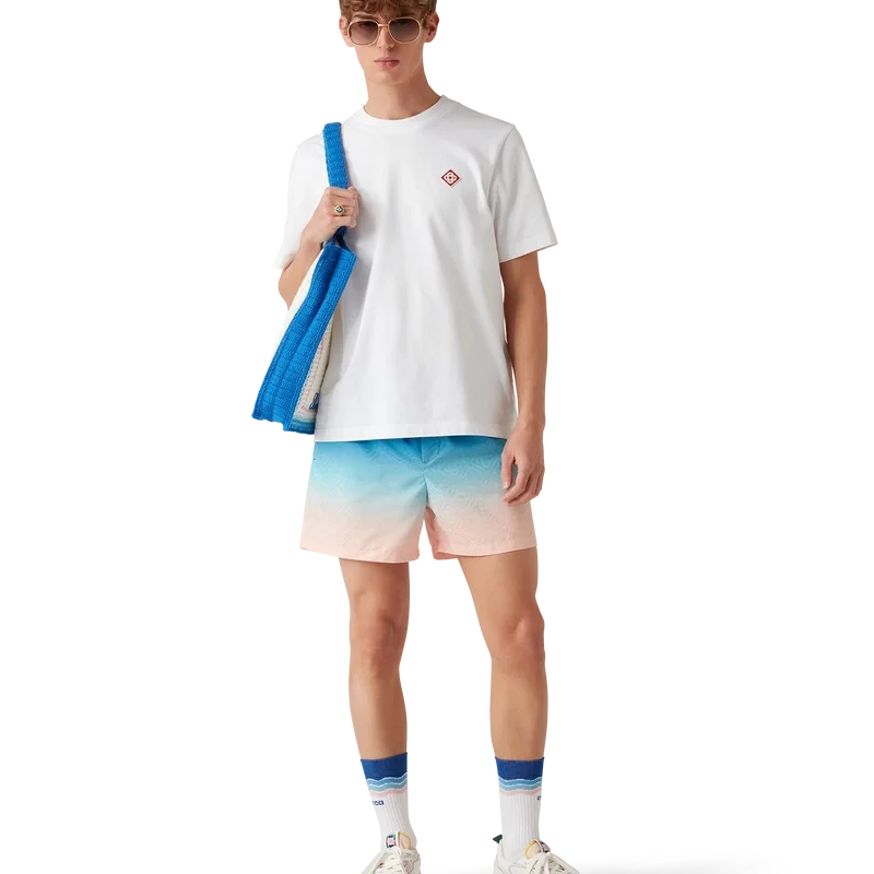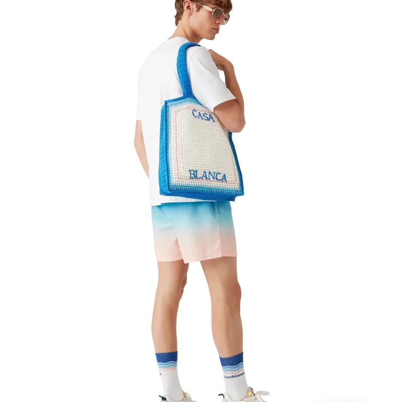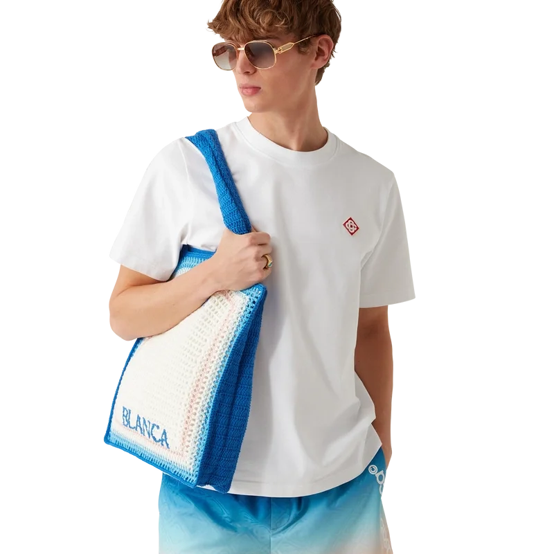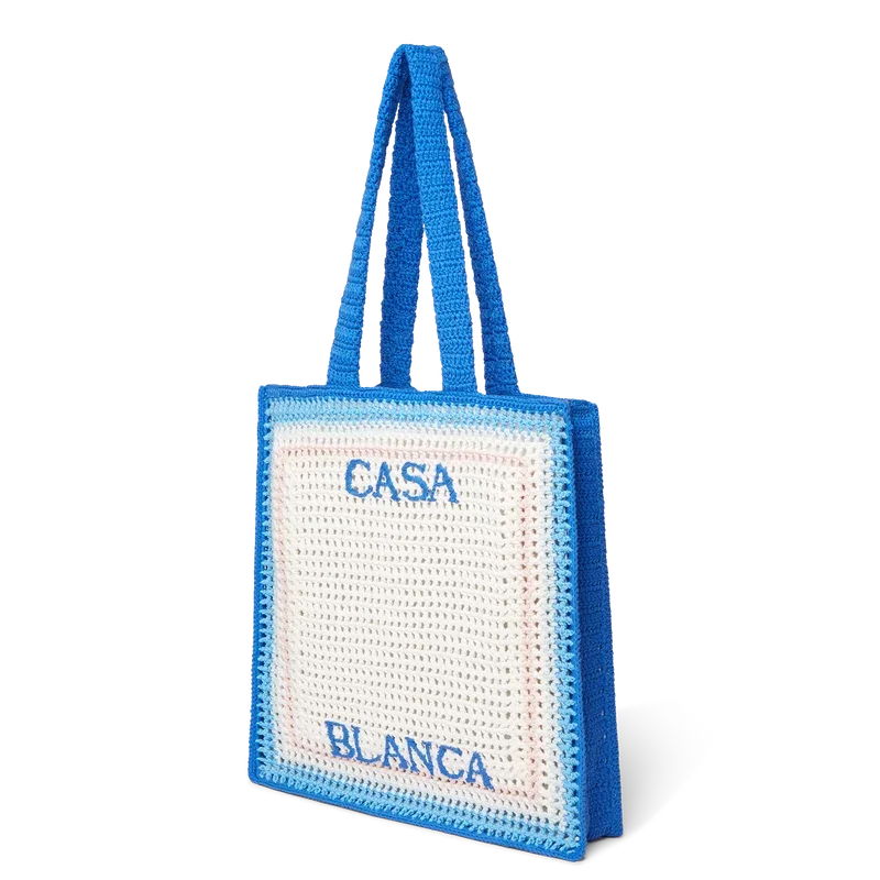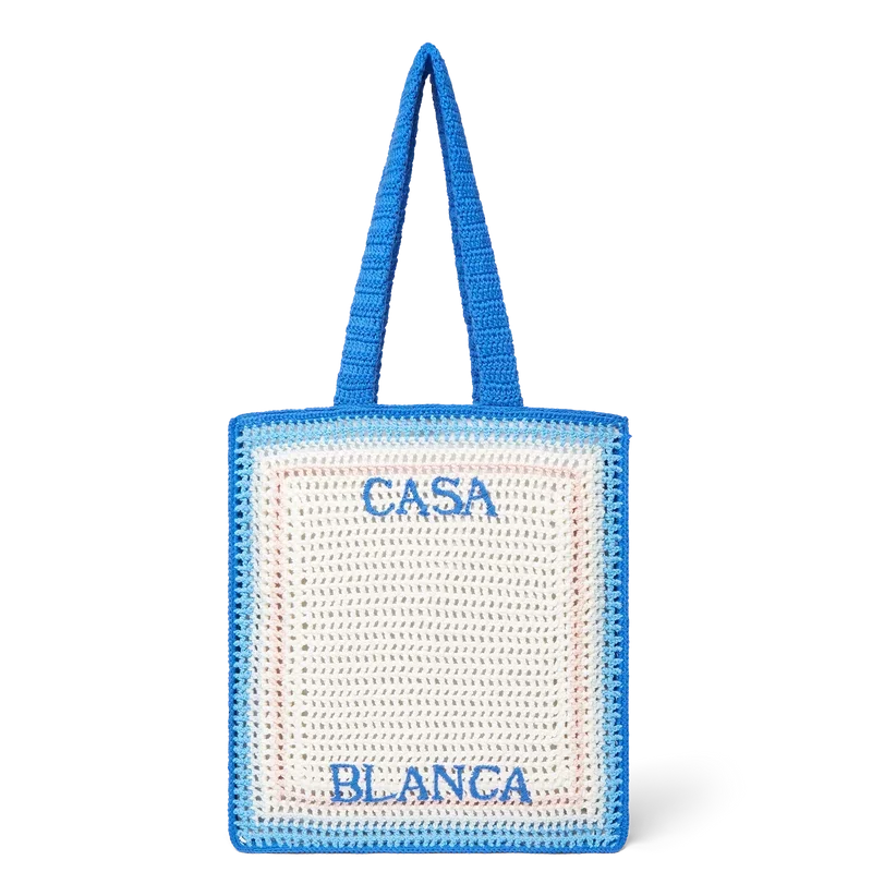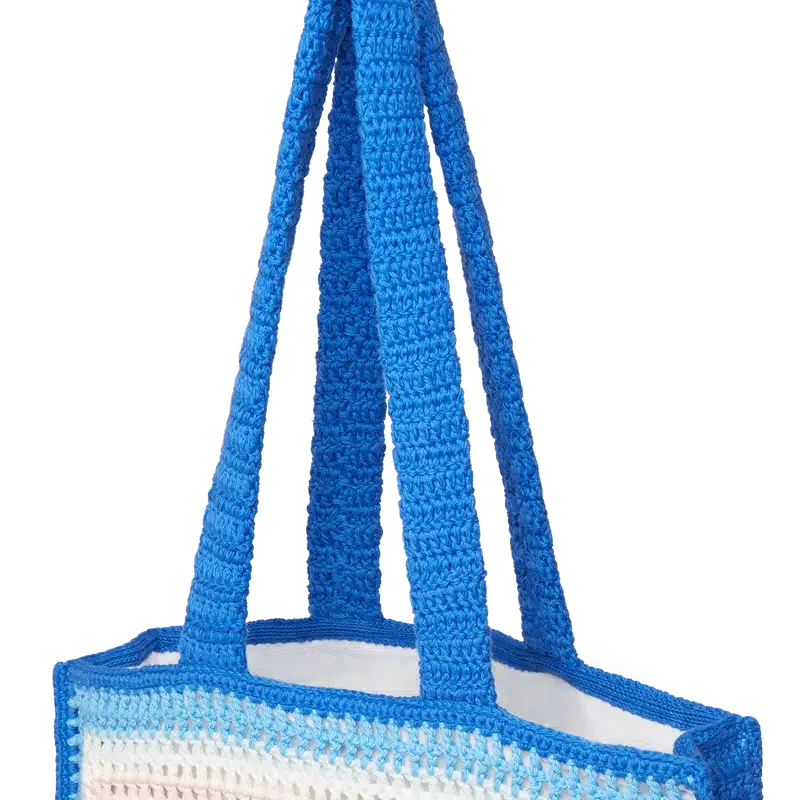 El bolso de ganchillo a rayas es un modelo tejido a mano con tela de algodón de ganchillo y presenta una silueta holgada. Se completa con un logotipo negro bordado y asas que permiten llevar este bolso tipo tote colgado del hombro o en la mano.