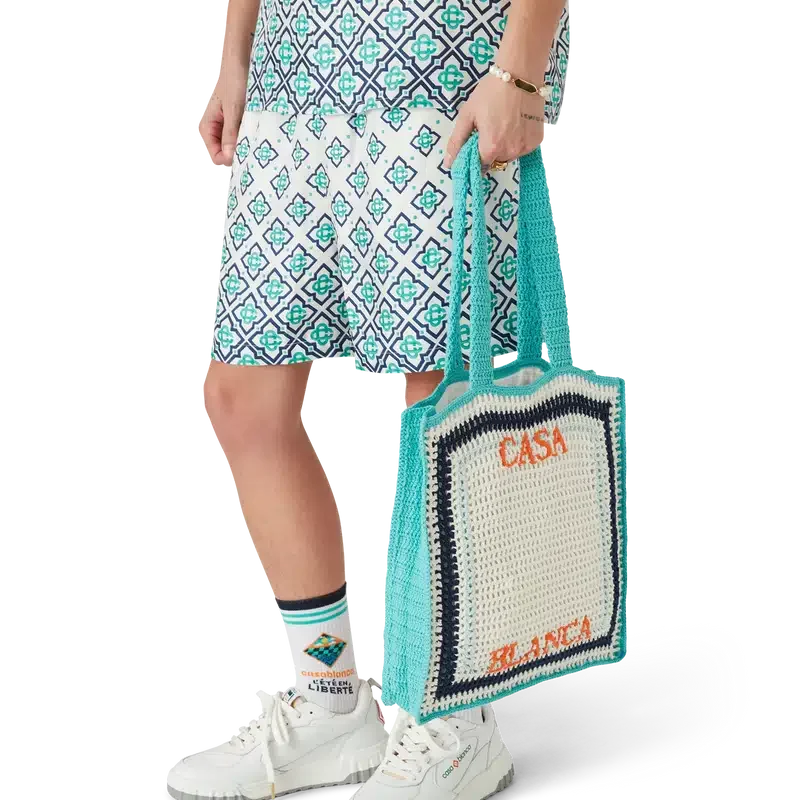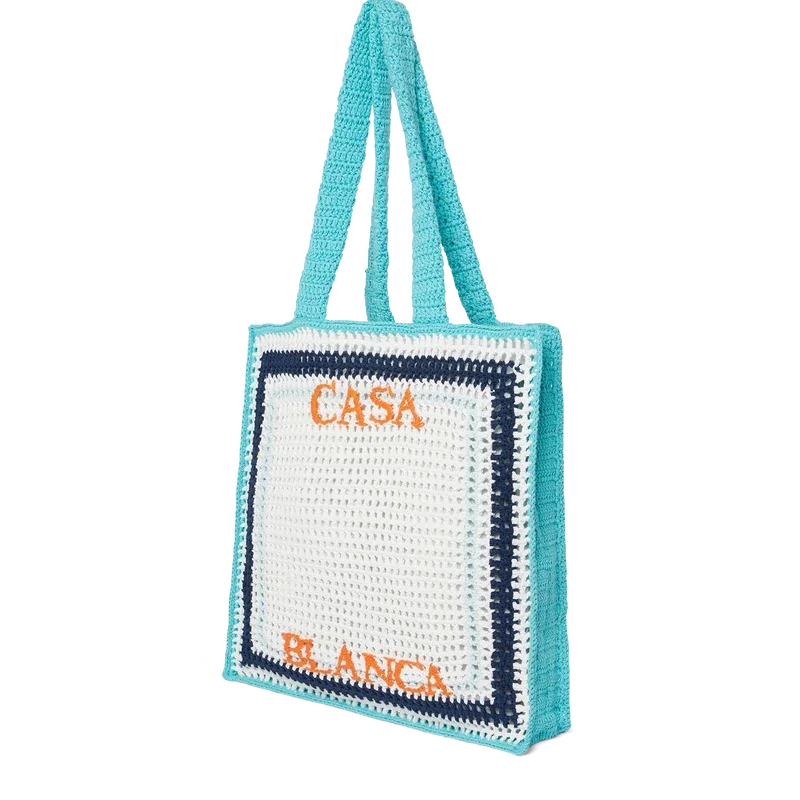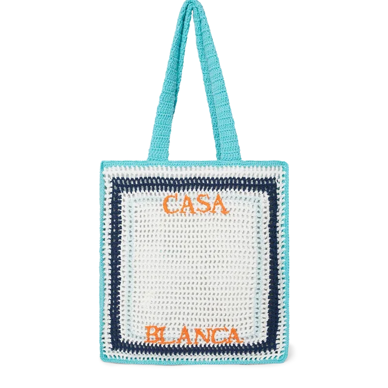 El bolso de ganchillo a rayas es un modelo tejido a mano con tela de algodón de ganchillo y presenta una silueta holgada. Se completa con un logotipo de Casablanca bordado en capas y asas que permiten llevar este bolso tipo tote colgado del hombro o en la mano.