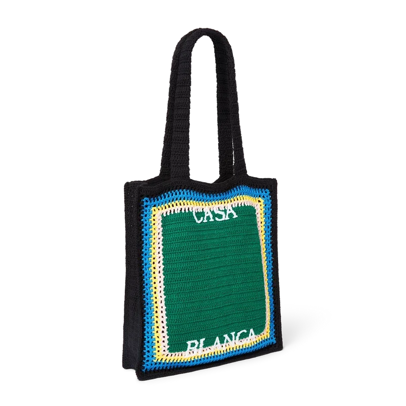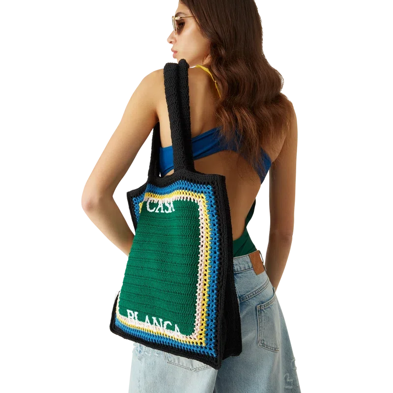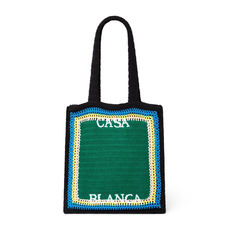 El bolso de ganchillo es un modelo de punto confeccionado con tejido de algodón de ganchillo y presenta una silueta holgada. Se completa con un logotipo negro bordado y asas que permiten llevar este bolso tipo tote al hombro o en la mano.