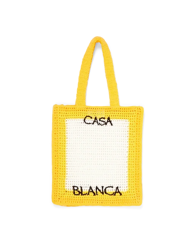 El bolso de ganchillo es un modelo en amarillo y blanco diseñado para completar un conjunto de verano. Confeccionado en 100 % algodón, el bolso tiene una silueta holgada con un logotipo negro bordado y asas que permiten llevarlo al hombro o en la mano.