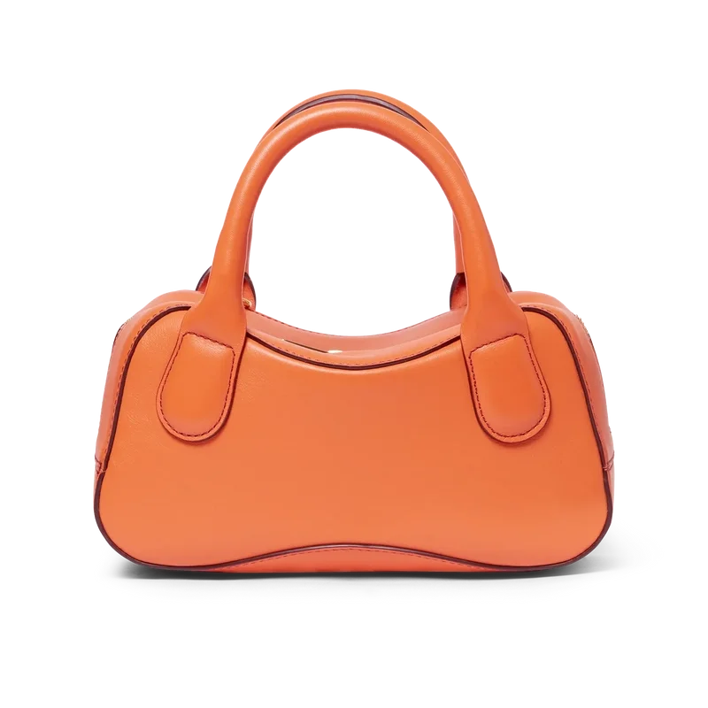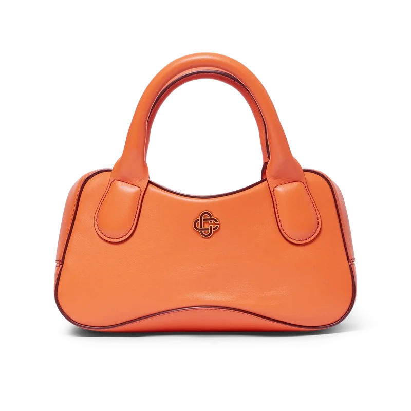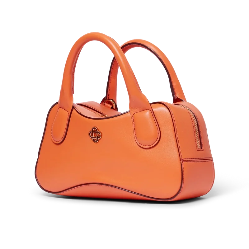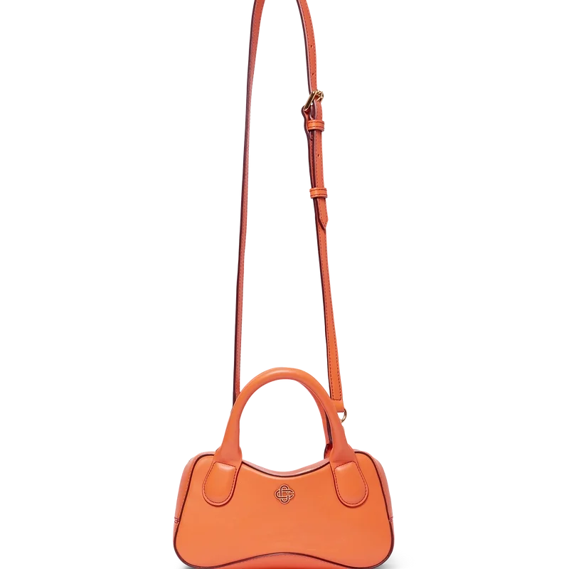 El bolso Micro Bowling naranja está confeccionado en piel de becerro italiana y adornado con el logotipo CC entrelazado de la casa en herrajes metálicos de alta calidad. Cuenta con cierre de cremallera, una correa ajustable y desmontable, dos asas y un bolsillo interior. Se suministra con una bolsa protectora con la marca Casablanca, una caja de regalo y un folleto con los detalles del producto.