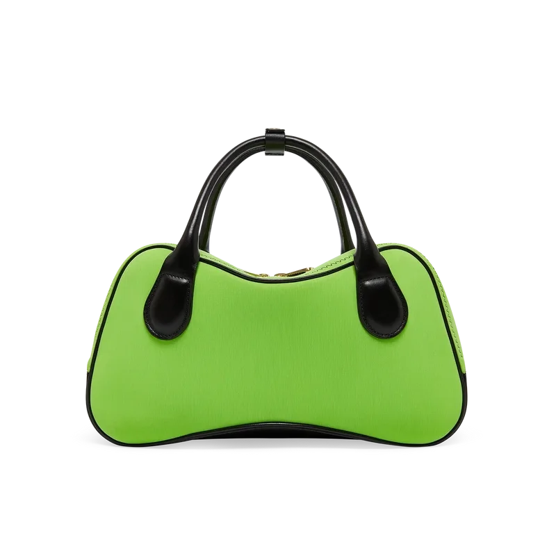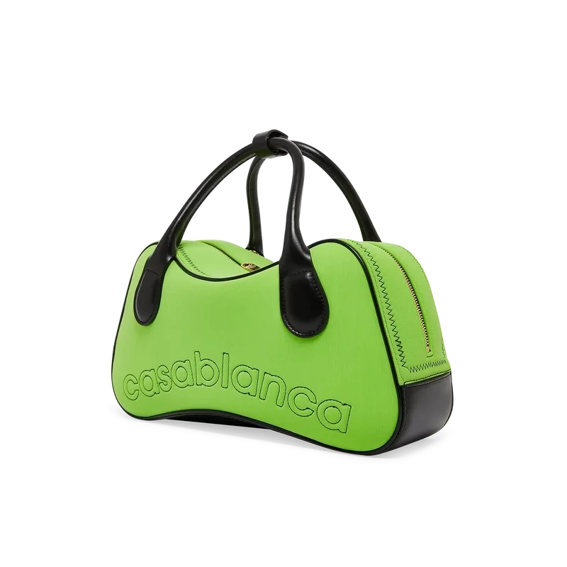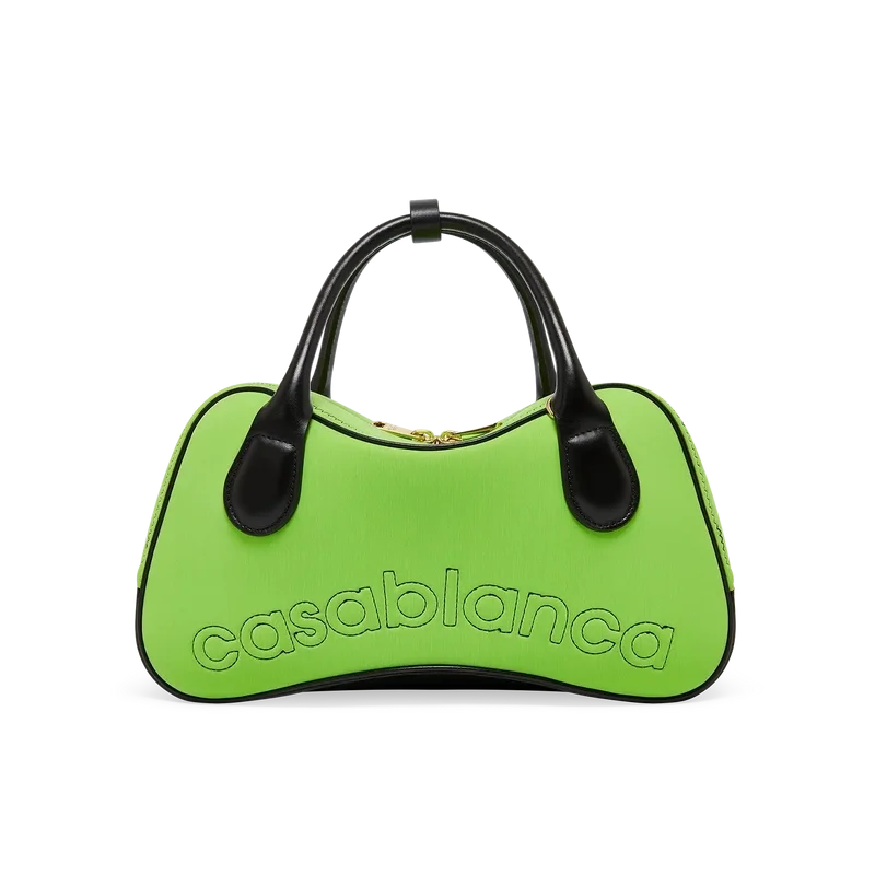 El bolso mini Bowling verde está confeccionado en piel de becerro italiana y adornado con el logotipo Casablanca característico de la casa. Cuenta con herrajes metálicos de alta calidad, cierre de cremallera, ribetes, una correa de hombro ajustable y dos asas.