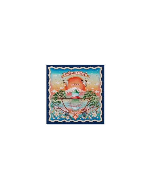 El pañuelo de seda mediano Tennis Club es un diseño estampado confeccionado en tejido de sarga de seda que presenta el diseño característico de la casa utilizando nuestra disposición clásica, pero con arte tradicional japonés, lo que lo convierte en una pieza con una narrativa muy potente. Rematado con un borde ondulado a rayas azules y blancas.
