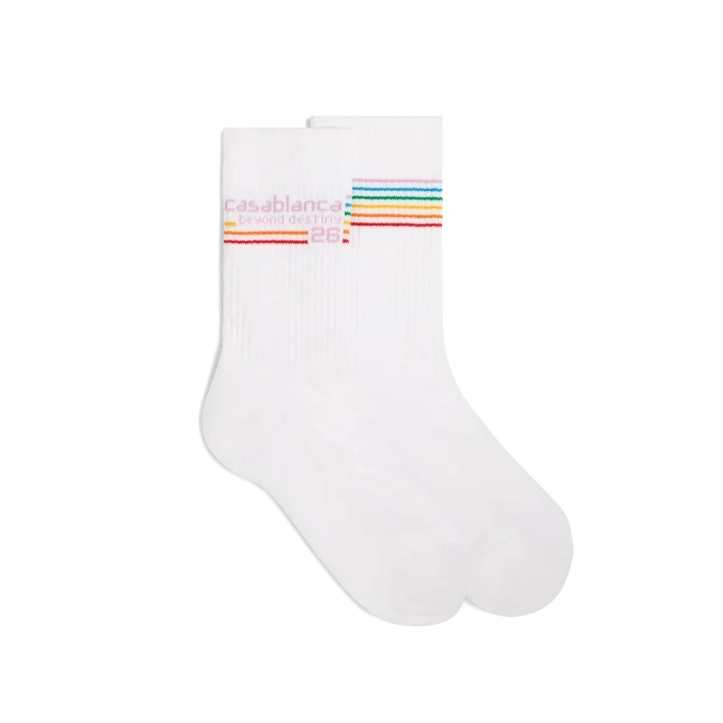 Los calcetines Beyond Destiny Stripe presentan un diseño refinado con marcas superpuestas inspiradas en los videojuegos, lo que les da un toque divertido y futurista, y un patrón de rayas multicolores. Cuentan con puños acanalados y el logotipo de Casablanca en contraste en los bordes.