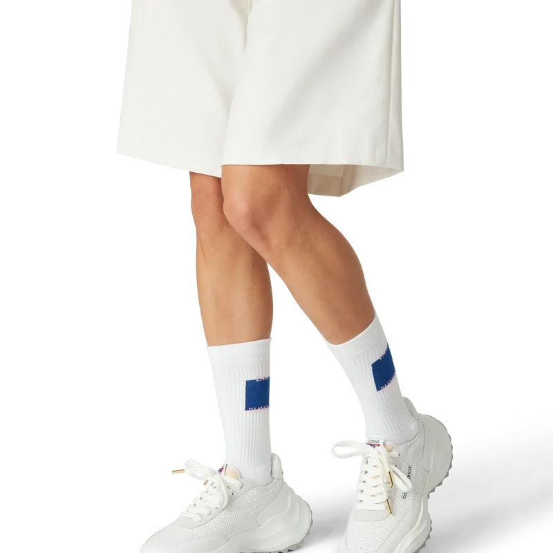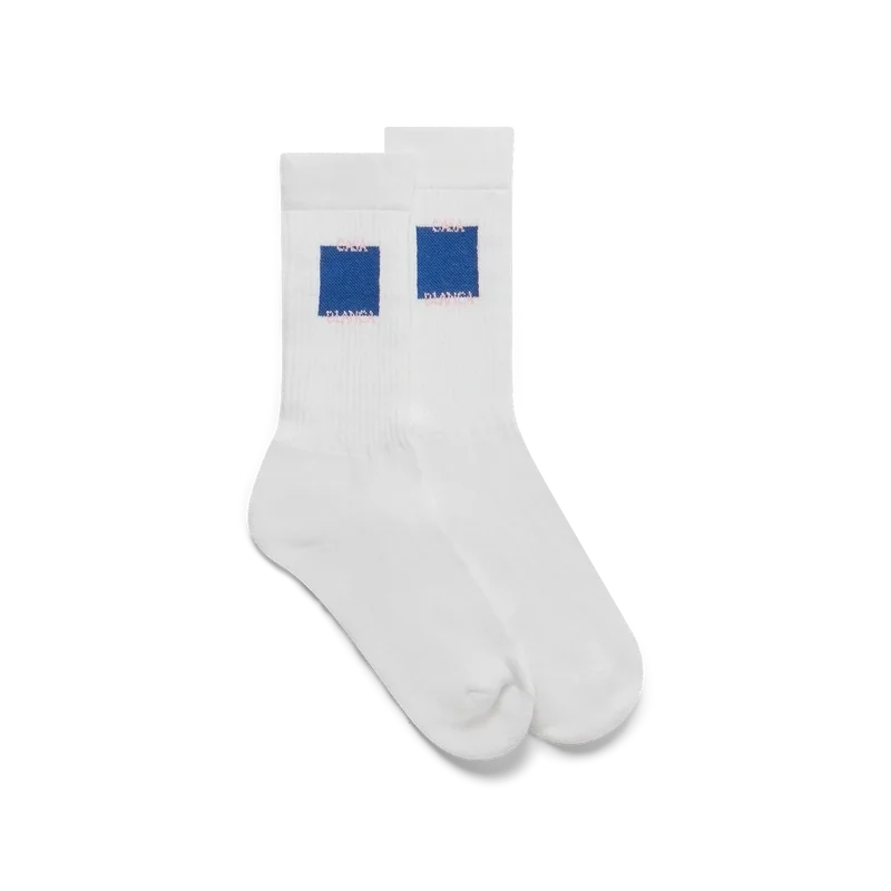 Los calcetines Blue Casa Square están confeccionados con un tejido de mezcla de algodón y presentan el logotipo apilado de la casa con un diseño de cuadrado azul. Con puños acanalados.