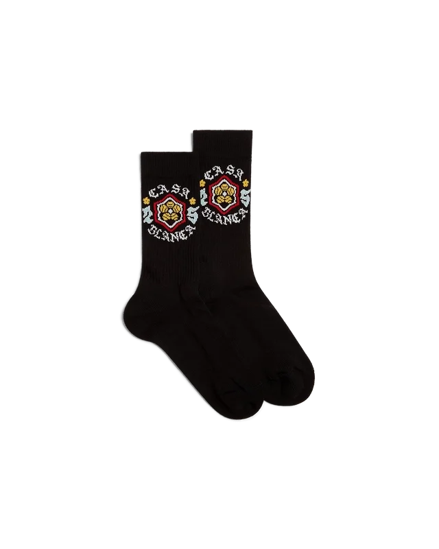 Los calcetines Emblem son un diseño deportivo confeccionado en tejido de mezcla de algodón y decorado con un diseño de temporada con el logotipo de Casablanca. Nos inspiramos en la subcultura japonesa para uno de nuestros temas principales. Acabados con puños y bordes acanalados.