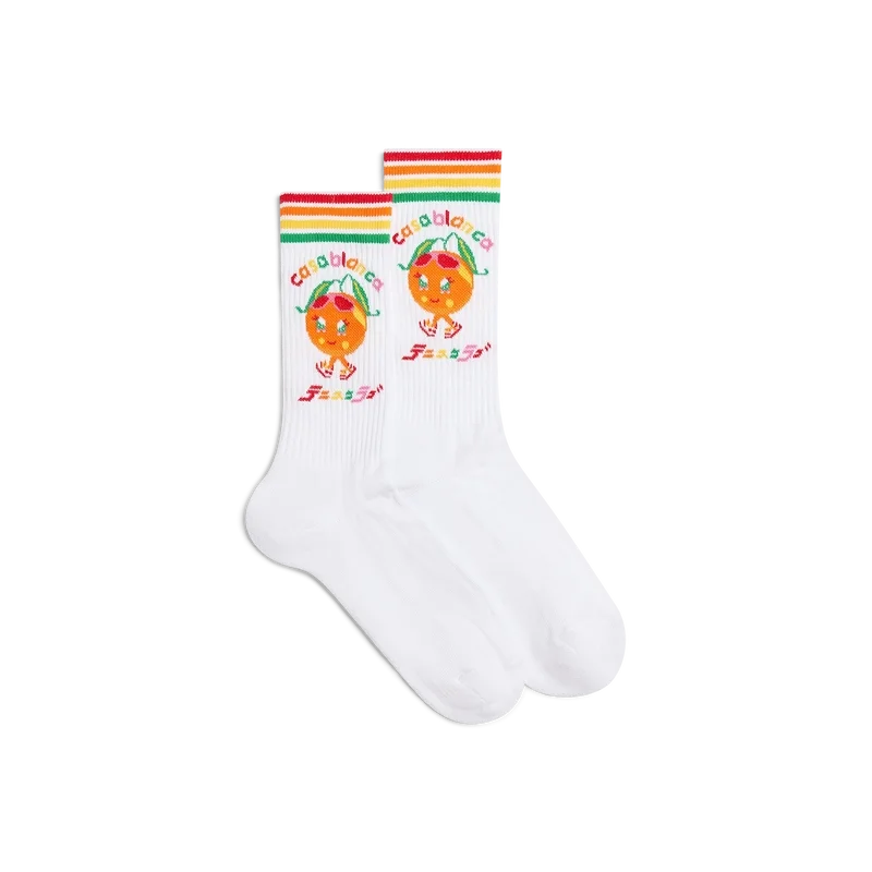 Los calcetines Kawaii Orange son unos calcetines deportivos blancos, confeccionados en tejido de mezcla de algodón, y presentan el diseño de esta temporada de este personaje, representado como una naranja, otra figura clave de nuestro universo, con accesorios de Casa Sport, gafas y tenis. Cuentan con puños acanalados y detalles de rayas verdes, amarillas, naranjas, rojas y blancas en los puños.