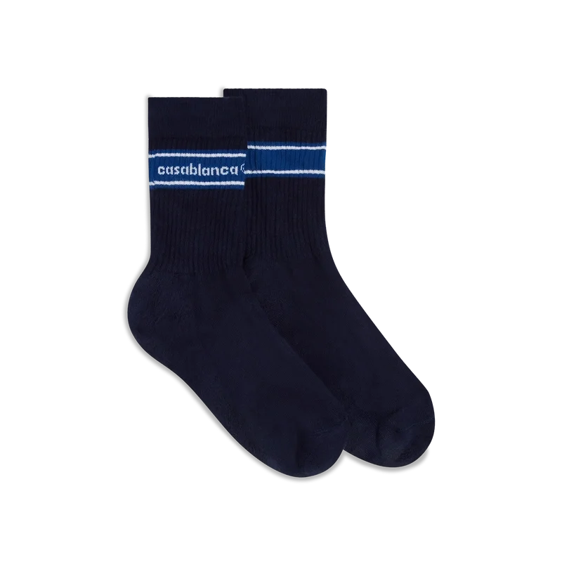 Los calcetines Sporty Stripe presentan un diseño refinado con detalles de rayas. Esta pieza encarna la estética Apras-Sport de la casa con sofisticados códigos atléticos. Se completan con puños acanalados y un logotipo de Casablanca en contraste alrededor de los puños.
