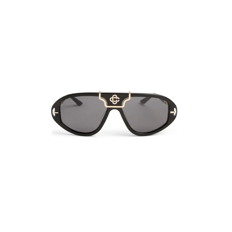 La llamativa estructura de acetato en negro y dorado de las gafas de sol Hacienda define estas gafas de montura rectangular. Aquí, el emblemático logotipo Diamond Monogram de Casablanca se encuentra en el puente. Las lentes grises ofrecen protección 100 % contra los rayos UV y el estilo se completa con una caja de Casablanca, un paño de limpieza y un folleto de garantía.