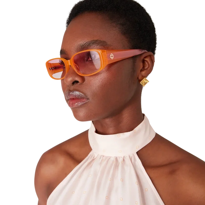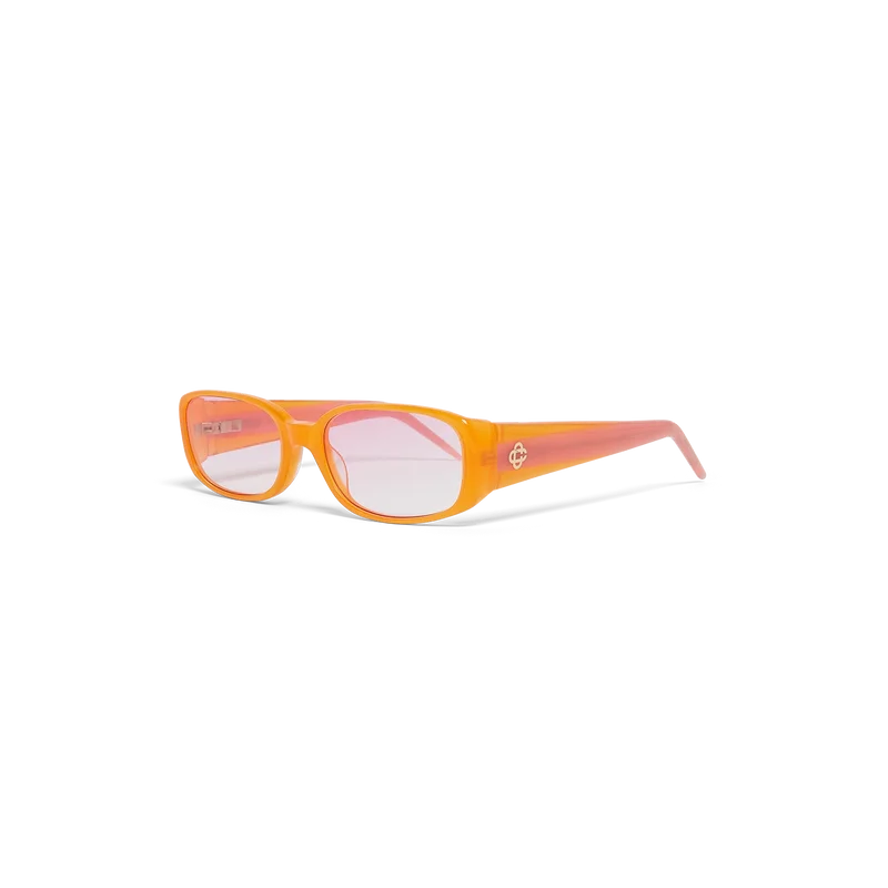 Las gafas de sol delgadas en rosa y naranja tienen un diseño ovalado elaborado con una estructura de acetato que presenta el emblemático logotipo CC entrelazado chapado en oro situado en las patillas. Las lentes rosas protegen contra los rayos UV y el modelo se completa con una caja de regalo, un paño de limpieza, la garantía y un folleto con los detalles del producto.