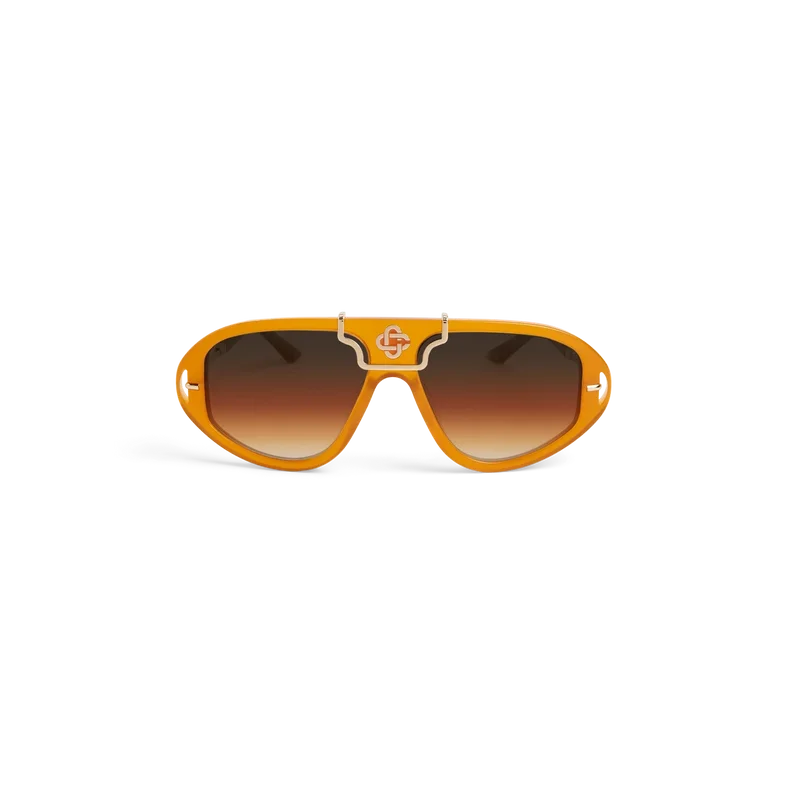 La llamativa estructura de acetato naranja y dorado de las gafas de sol Hacienda define estas gafas de montura rectangular. Aquí, el logotipo característico del Diamond Monogram de Casablanca se encuentra en el puente. Las lentes degradadas Sunset ofrecen una protección UV del 100 % y el modelo se completa con un estuche de Casablanca, un paño de limpieza y un folleto de garantía.