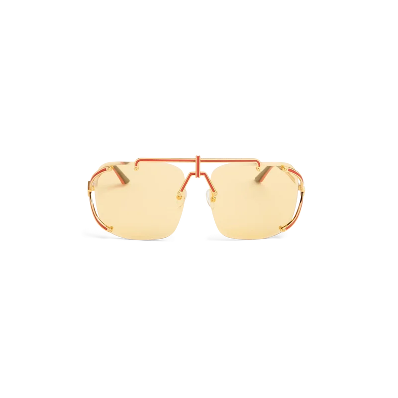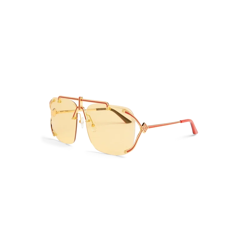 La estructura metálica dorada y roja de las gafas de sol Pilot define este modelo de montura Pilot. Aquí, el estilo característico se completa con un puente de temporada. Las lentes amarillas ofrecen protección 100 % contra los rayos UV y el modelo se completa con un estuche Casablanca, un paño de limpieza y un folleto de garantía.