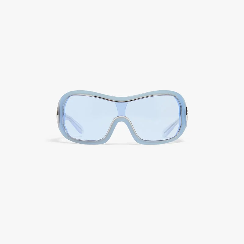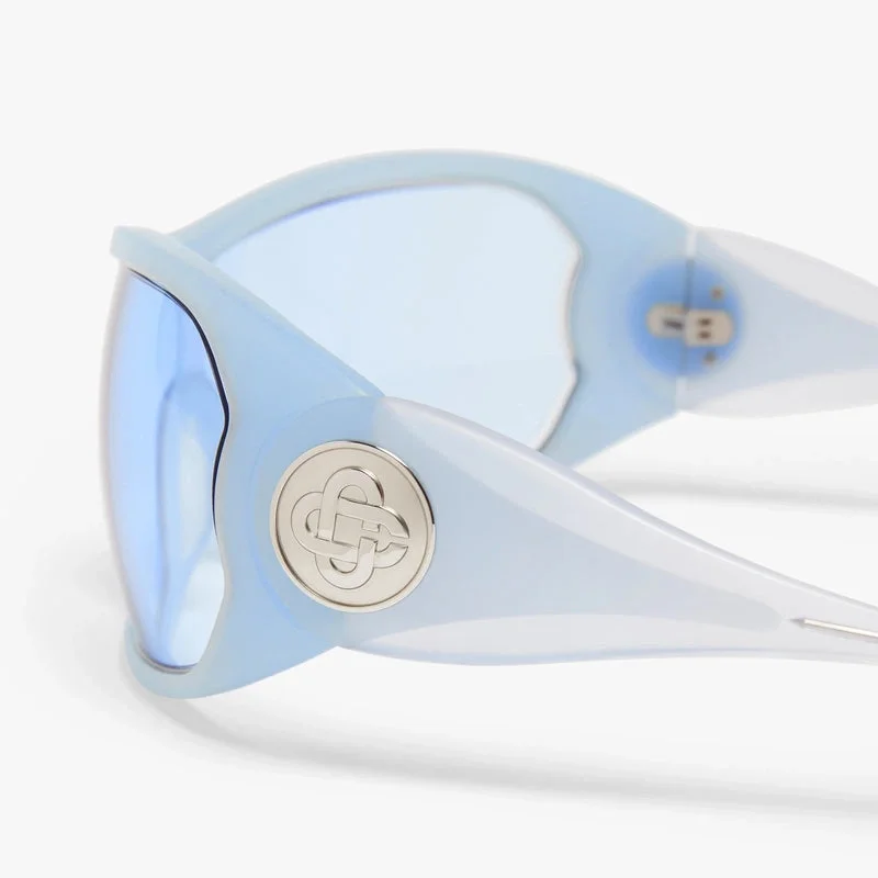 Las gafas de sol Blue Outline Shield están fabricadas en acetato y metal con una montura envolvente, y presentan una silueta arquitectónica elegante. Las lentes con degradado azul ofrecen una protección UV del 100 % y el estilo se completa con el logotipo CC entrelazado en tono plateado de la casa en las patillas, lo que aporta un toque final refinado.