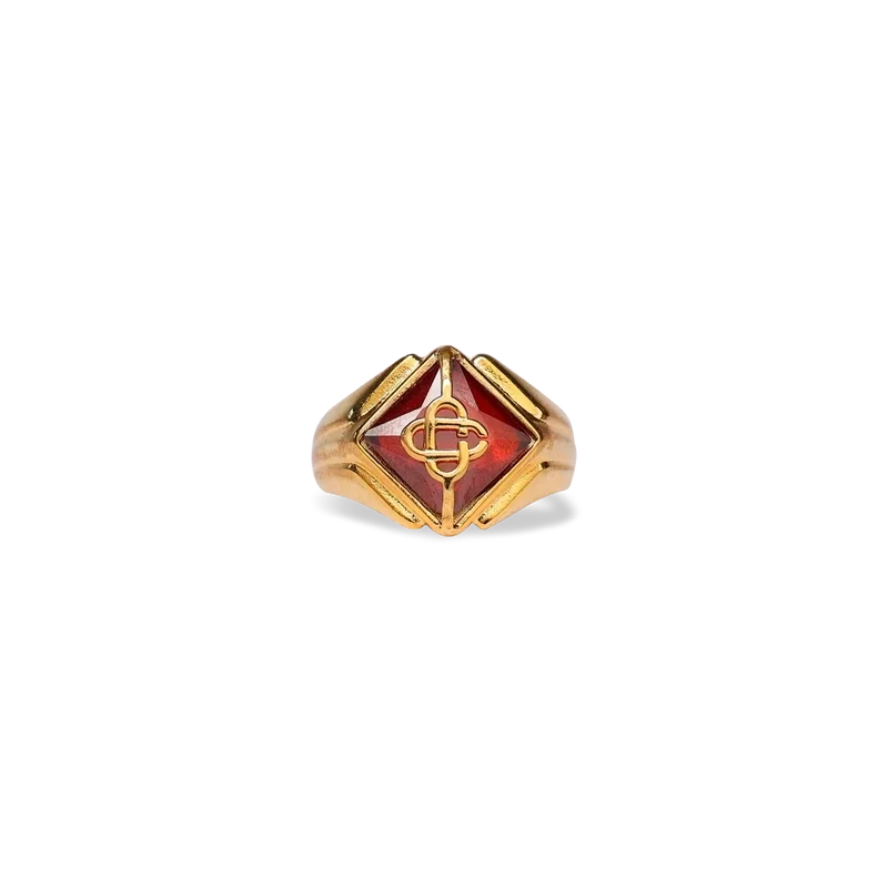 El anillo con sello Casa está elaborado en latón chapado en oro y cristales. Se completa con el logotipo de la casa, las letras «CC» entrelazadas con un diamante, y detalles pintados en el cuerpo del anillo. Esta pieza viene con una caja de regalo, una bolsa protectora y un folleto con detalles del producto.
