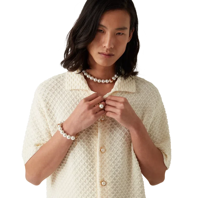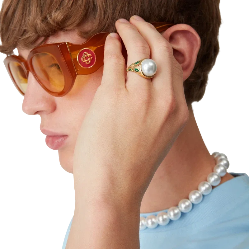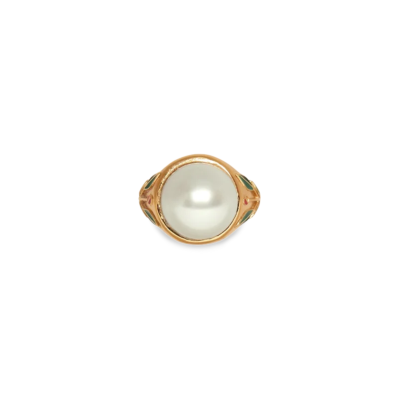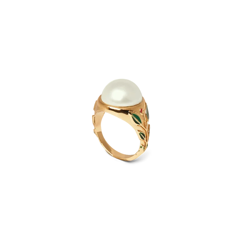El anillo de sello con perlas está elaborado en latón chapado en oro, esmalte y cabujones de perlas de vidrio. Con detalles florales pintados a mano en el cuerpo, esta pieza viene con una caja de regalo, una bolsa protectora con la marca y un folleto con los detalles del producto.