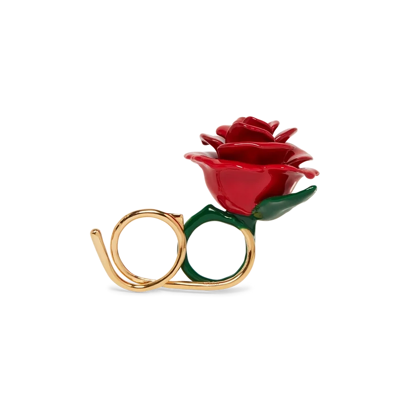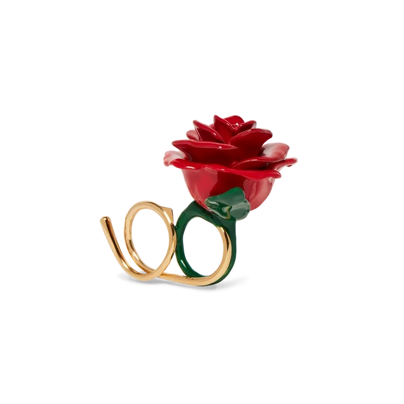El anillo doble Rose se inspira en los tatuajes de las subculturas de La. Está elaborado con esmalte pintado a mano y latón chapado en oro. La rosa se convierte en un eslabón y se entrelaza alrededor de tus dedos para formar un anillo doble.