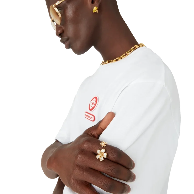El anillo Flower está diseñado con dos flores de diferentes tamaños y está elaborado en latón chapado en oro y esmalte. Este artículo se suministra con una bolsa de tela Casablanca, una caja y un folleto del producto.