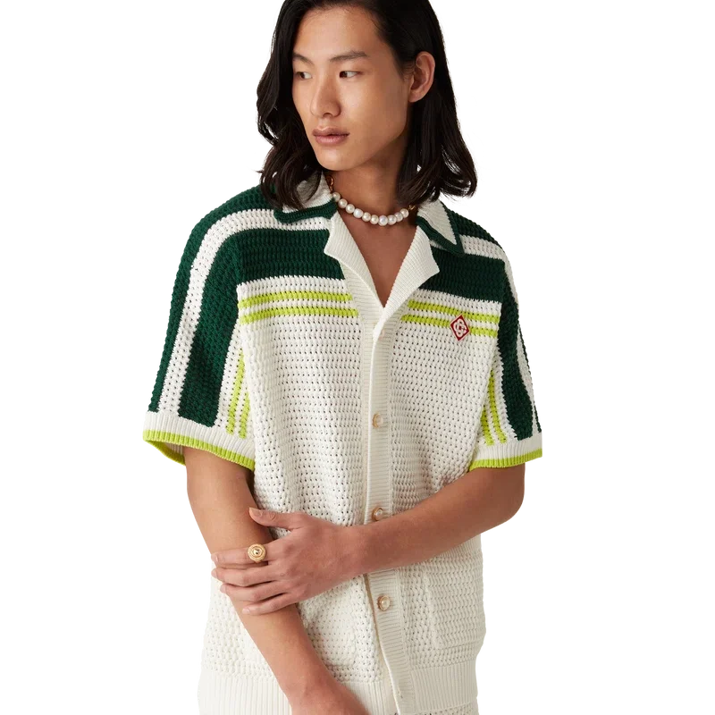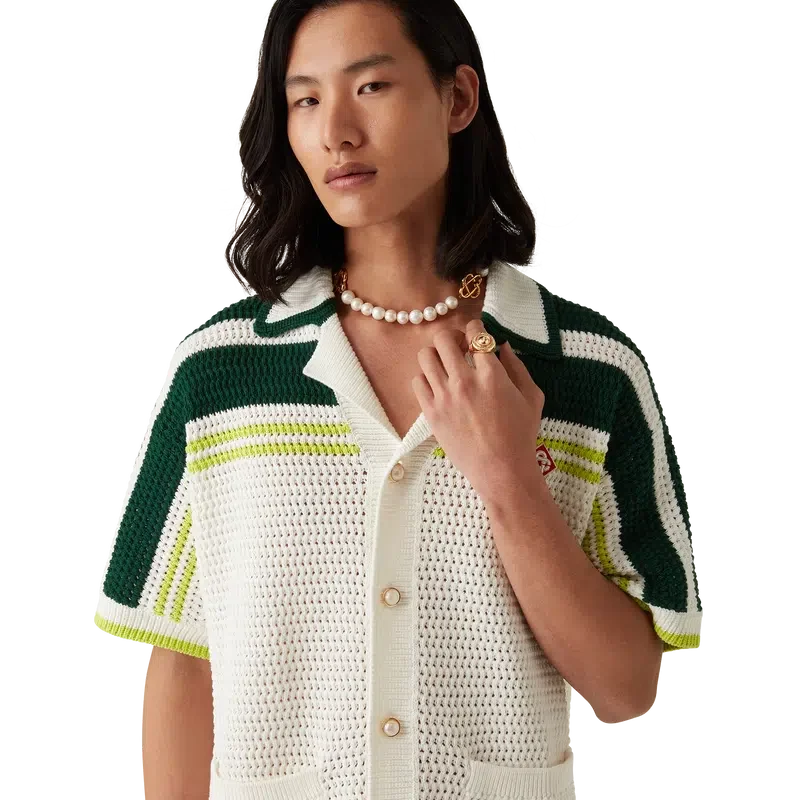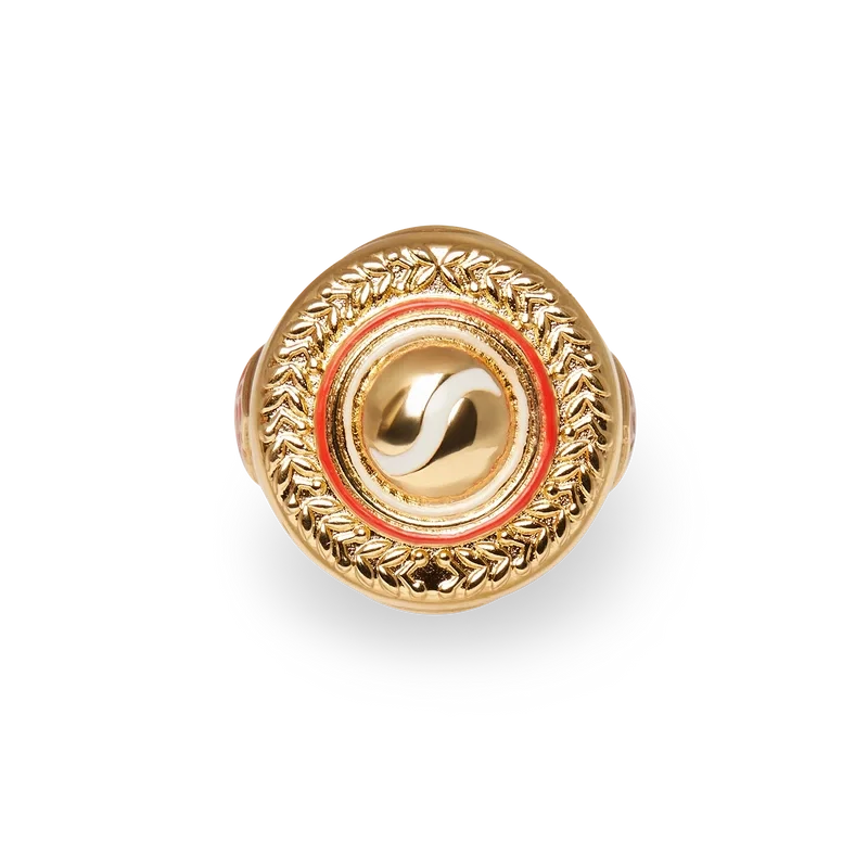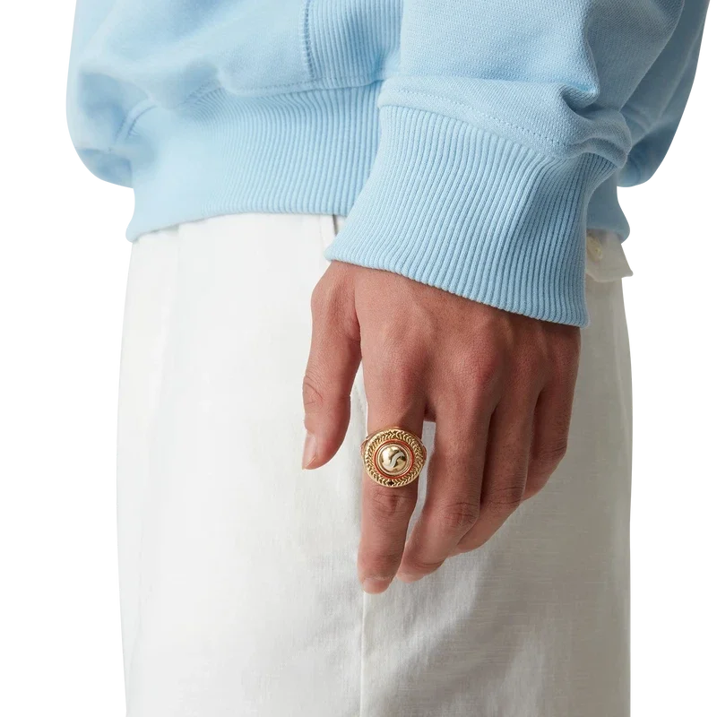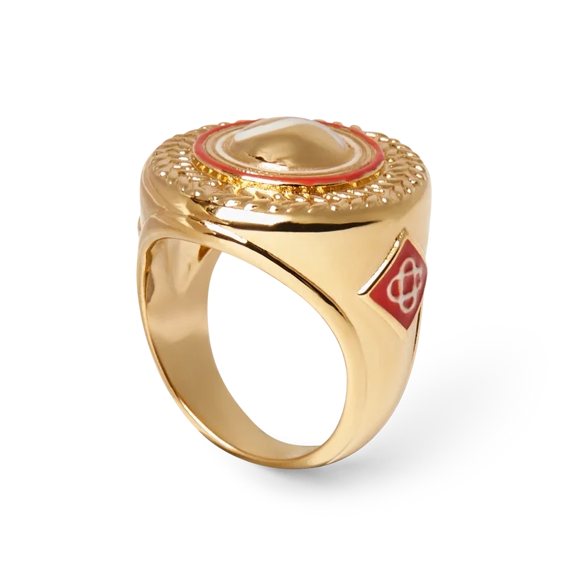 El anillo medallón deportivo está elaborado en latón chapado en oro y esmalte pintado a mano. Se completa con el logotipo de diamante característico de la casa en los anillos.