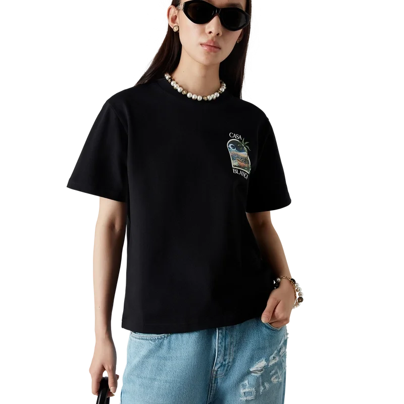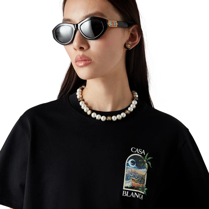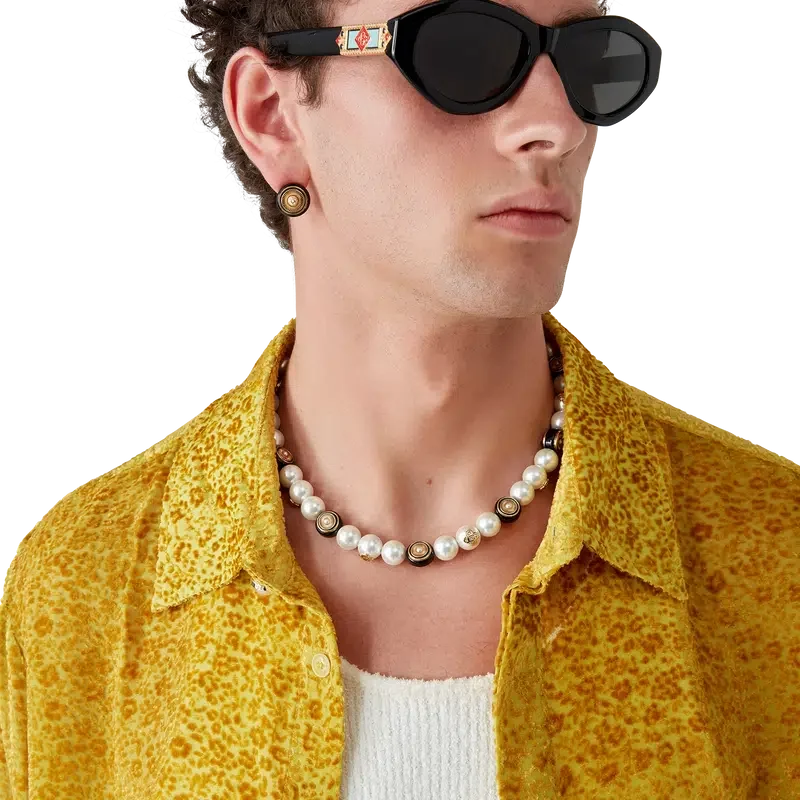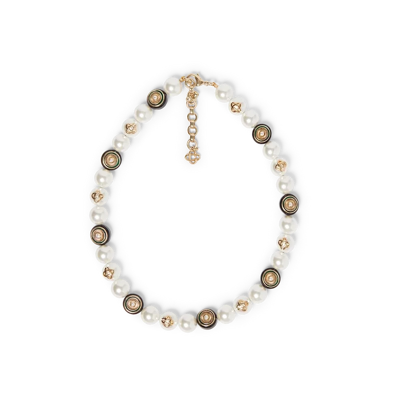 El collar Spoke Wheel está elaborado en latón chapado en oro, esmalte y perlas de agua dulce. Se completa con el logotipo CC entrelazado de la Maison, una cadena chapada en oro y un cierre de langosta.