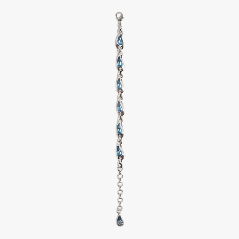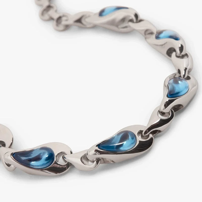 La pulsera con gotas de agua en tonos plateados y azules es un diseño elegante elaborado en latón y resina, con un delicado motivo de gotas de agua en tonos plateados y azules. Se completa con una refinada estructura de eslabones de cadena chapada en plata para un toque final sofisticado.
