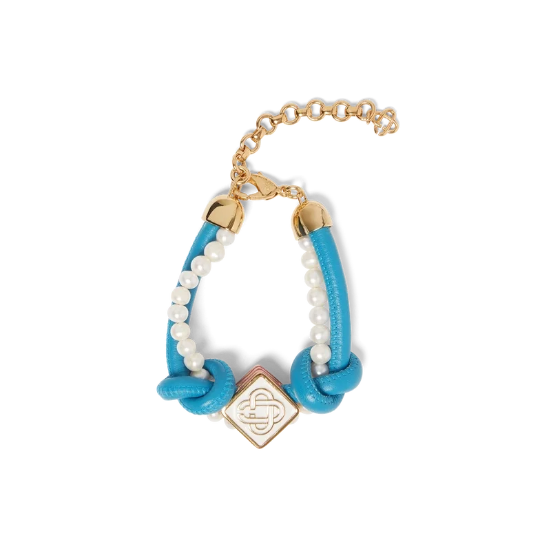 La pulsera de perlas con nudos azules está confeccionada en cuero y perlas de agua dulce y luce el logotipo de diamante característico de la casa. Se completa con un cierre de langosta y una cadena chapados en oro.<!–
