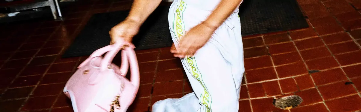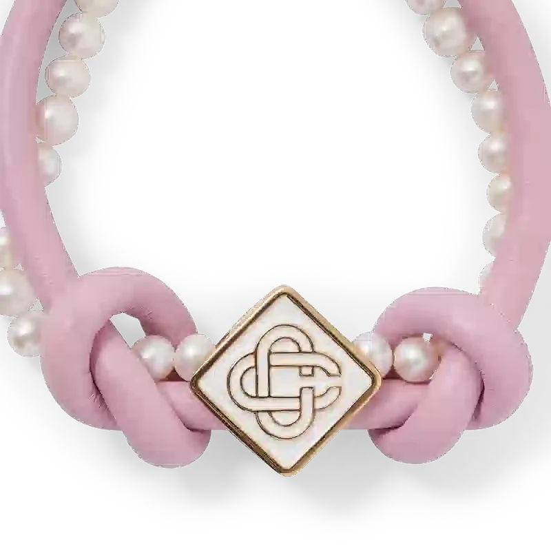 La pulsera de perlas con nudos rosa está confeccionada en cuero y perlas de agua dulce y luce el logotipo de diamante característico de la casa. Se completa con un cierre de langosta y una cadena chapados en oro.