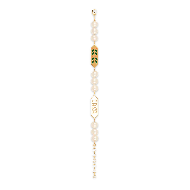 La pulsera Laurel Pearl presenta el diseño característico de la hoja de laurel y el logotipo de diamantes de la casa, elaborados con perlas de agua dulce, latón y esmalte pintado a mano. Se completa con una cadena chapada en oro y un cierre de langosta. Esta pieza viene con una caja de regalo, una bolsa protectora con la marca y un folleto con los detalles del producto.