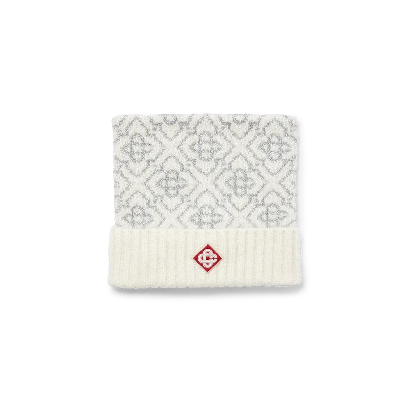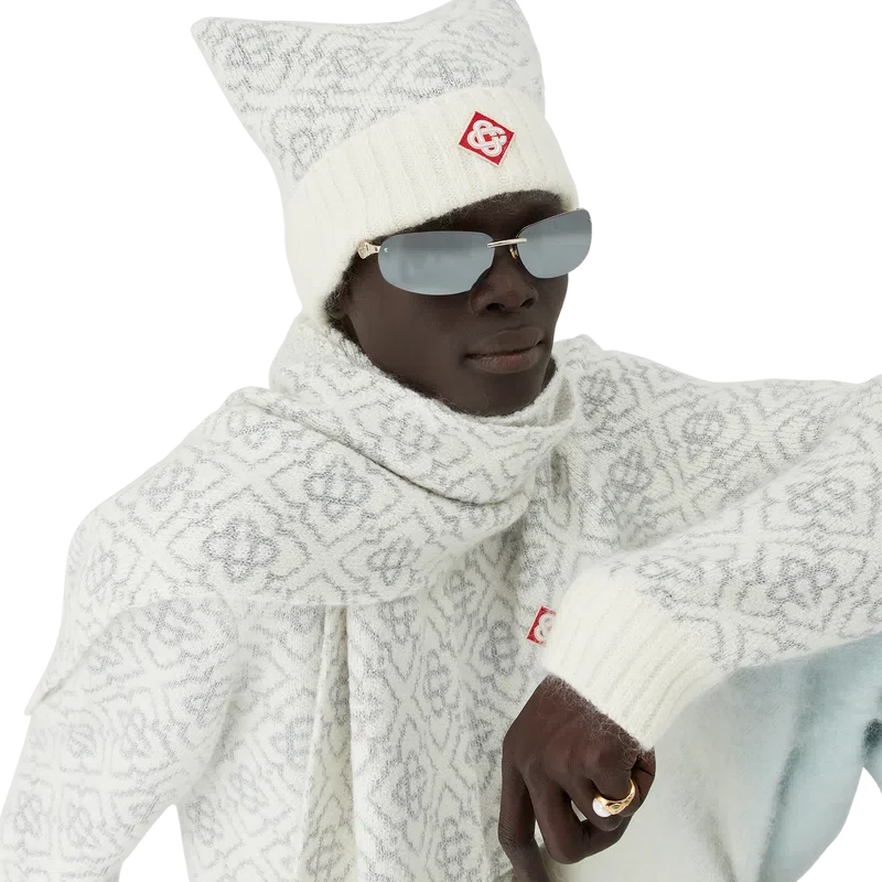 El gorro Ski es un diseño refinado confeccionado en tejido de mohair con el motivo Monogram blanco y gris de la casa, inspirado en los patrones de escarcha de las ventanas de las granjas tradicionales japonesas. Inspirado en los cristales de nieve de los bosques de bambú, el diseño encarna la elegancia de Apras-Sport.