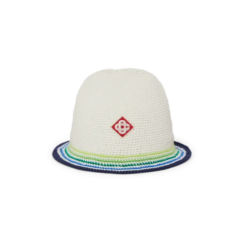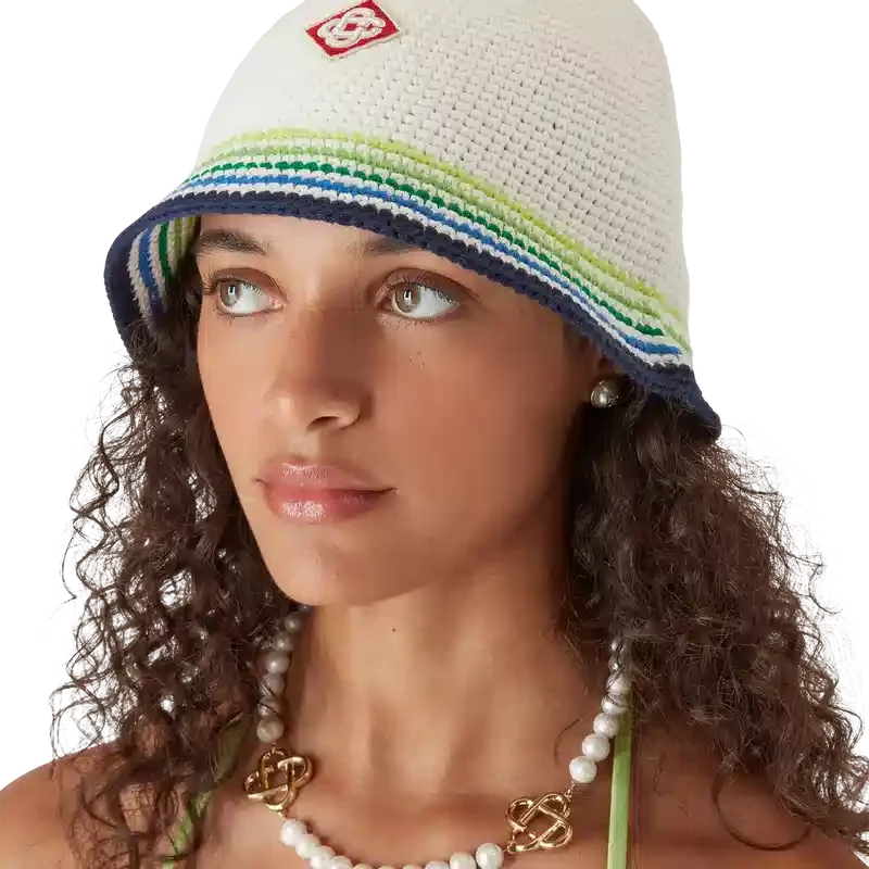 La gorra Beach Club es un refinado modelo tipo cubo confeccionado en algodón de ganchillo con el logotipo de diamante característico de la casa en el centro. Rematada con una visera a rayas azules, verdes, amarillas y blancas.