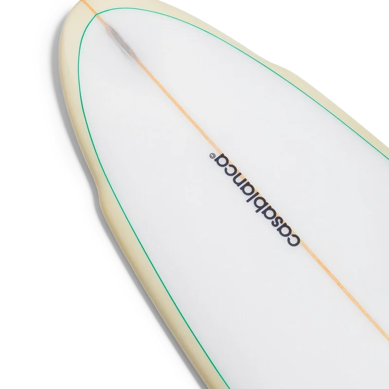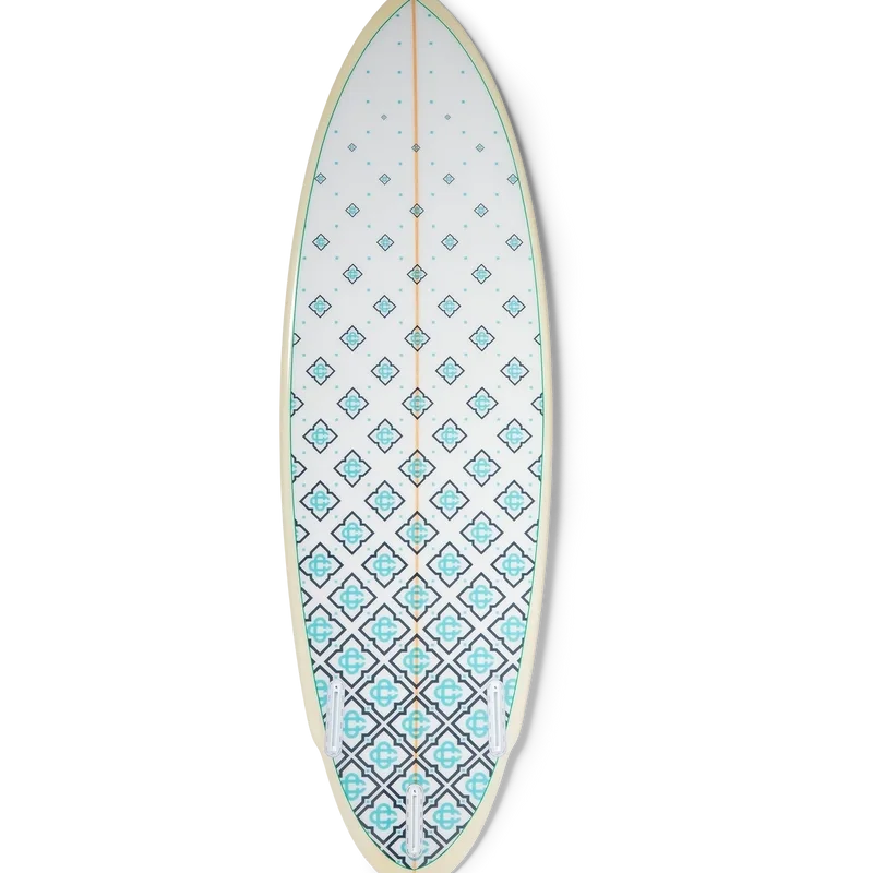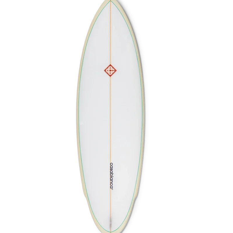 La tabla de surf Casablanca está fabricada con fibra de vidrio de primera calidad, espuma de poliuretano y resina de poliéster, y presenta el estampado monograma degradado de la casa en la parte inferior y la marca Casablanca con el logotipo del diamante característico en la cubierta. Se completa con un larguero de madera, una cubierta blanca con un borde verde menta y cantos de color amarillo claro. La tabla de surf Casablanca mide 178,2 cm (de la punta a la cola) x 53 cm (de rail a rail en el punto más ancho). Este artículo no incluye quillas ni leash.