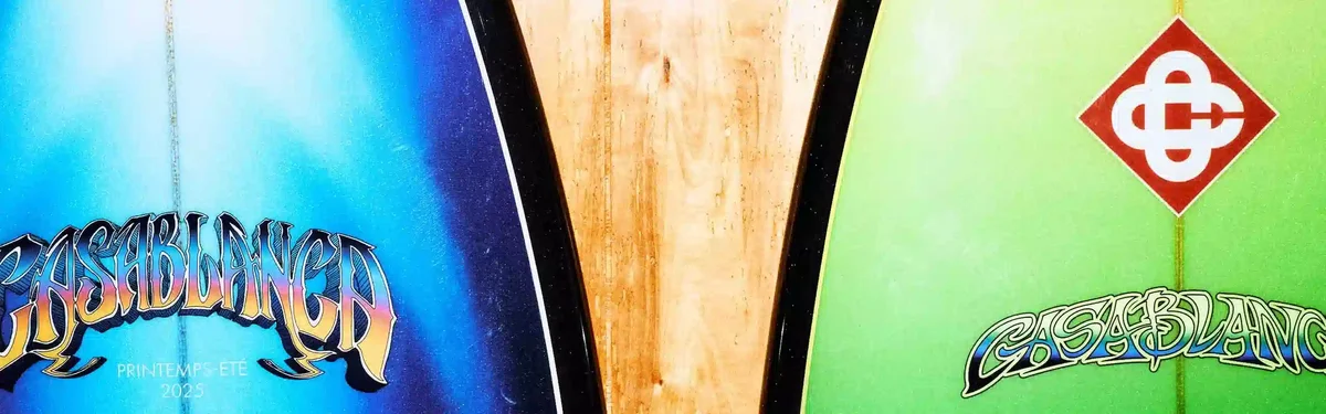 La tabla de surf retro Casablanca hecha a mano presenta un diseño refinado con el degradado de la temporada, fabricada en espuma de poliuretano con resina de poliéster y fibra de vidrio. Se completa con detalles multicolores en degradado y el logotipo de la marca, que capturan el enfoque sofisticado de la casa hacia los códigos del deporte y el ocio.