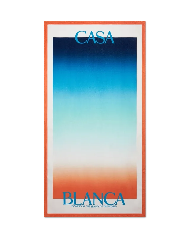 La toalla de playa Gradient es un diseño estampado confeccionado en tejido de rizo de algodón con el degradado de la temporada. Se completa con el logotipo apilado de la casa y un borde azul marino.