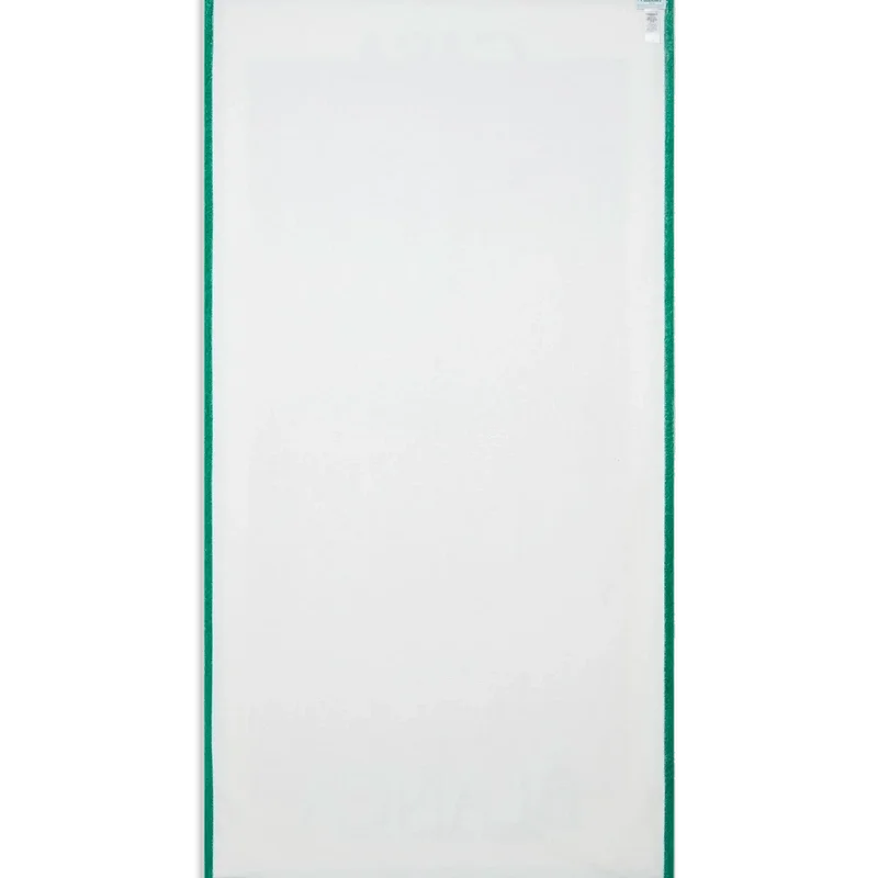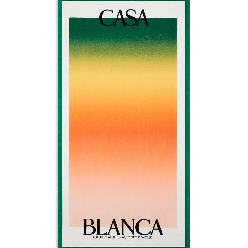 La toalla de playa Gradient está confeccionada en algodón orgánico y presenta el logotipo apilado de la casa sobre un fondo con estampado degradado de la temporada, representativo de los ricos intercambios entre disciplinas culturales en el arte, la música y el cine africanos. Rematada con un borde blanco y ribetes verdes.