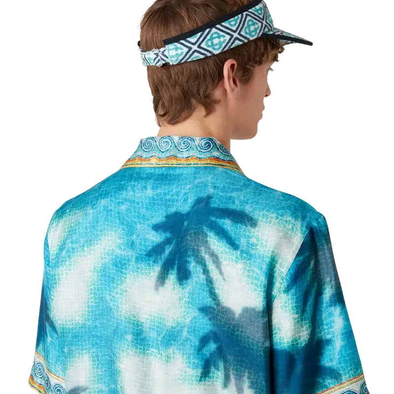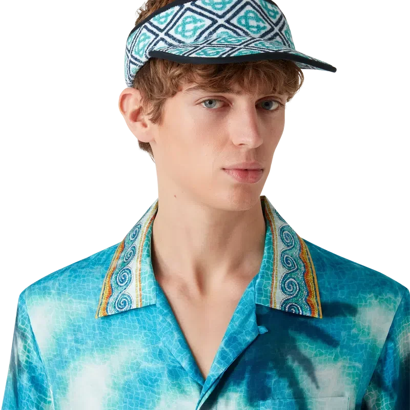 La visera de rizo Monogram es un diseño estampado confeccionado en tejido de mezcla de algodón. Cuenta con una visera, una hebilla ajustable y detalles en azul marino.