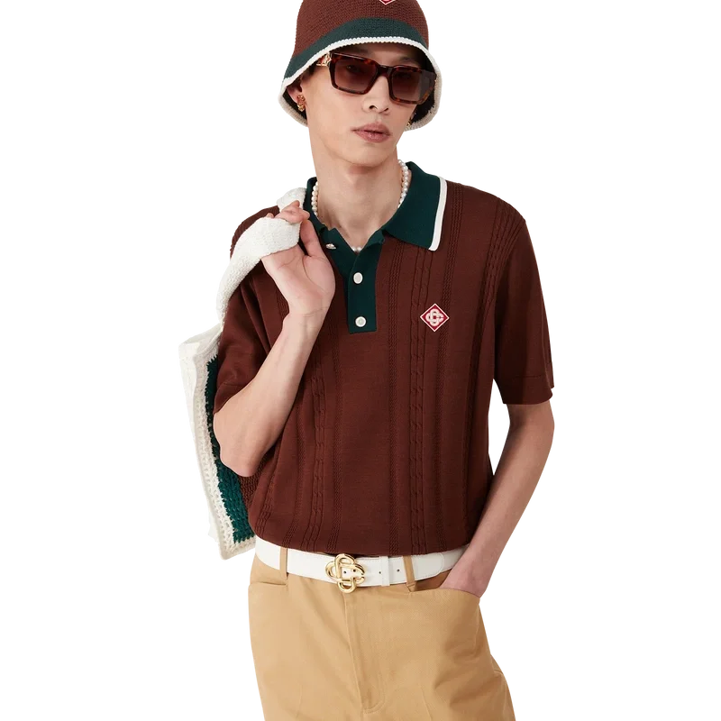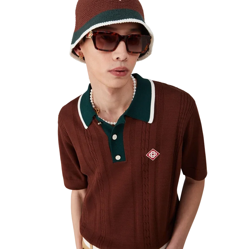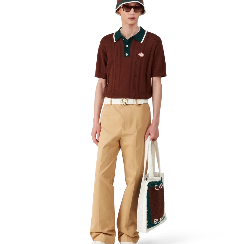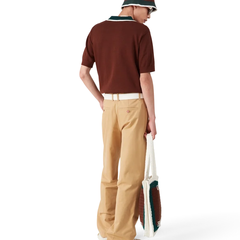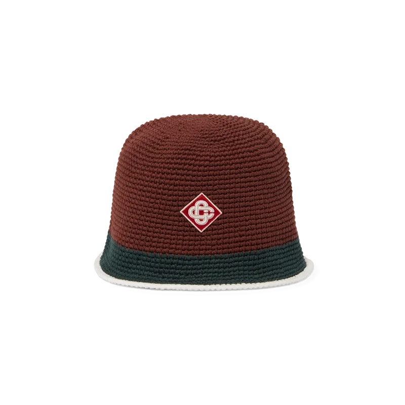 El sombrero de ganchillo a rayas es de estilo cubo, confeccionado con un tejido de algodón de ganchillo de textura suave y tejido abierto: el básico definitivo para el verano. Se completa con un ala verde con detalle de borde blanco y el logotipo del diamante característico de la casa en el centro.