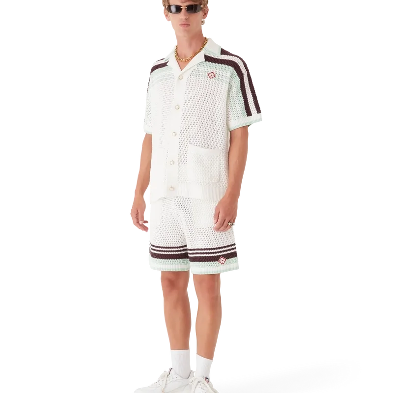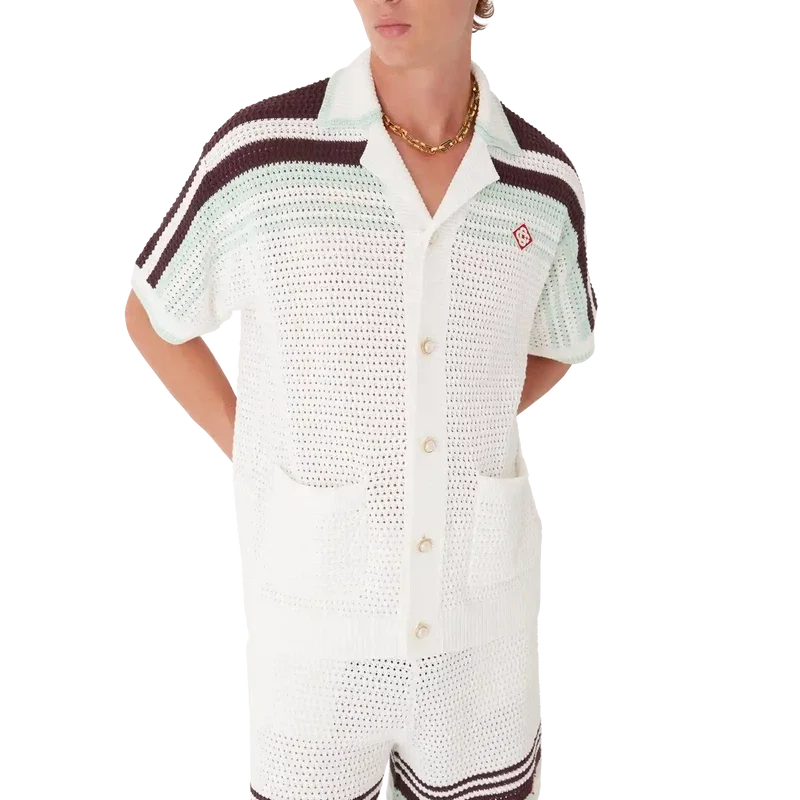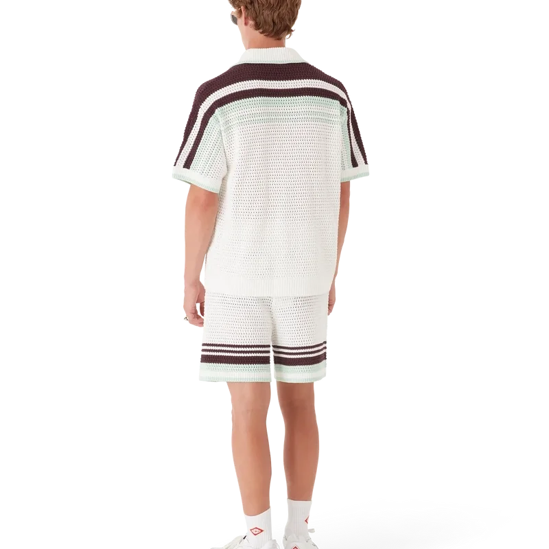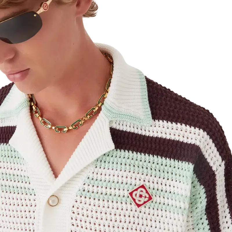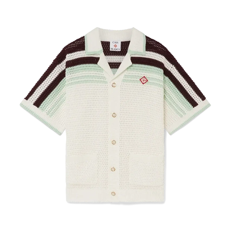 La camisa de tenis de croché es un diseño de punto de manga corta confeccionado en tejido de algodón de croché en suaves colores naturales y cuenta con el logotipo de diamante característico de la casa. Se completa con botones de perla con borde dorado característicos, detalles de rayas en los hombros y a lo largo de las mangas, bolsillos de parche en la parte delantera y detalle de borde rayado en el cuello y los puños.
