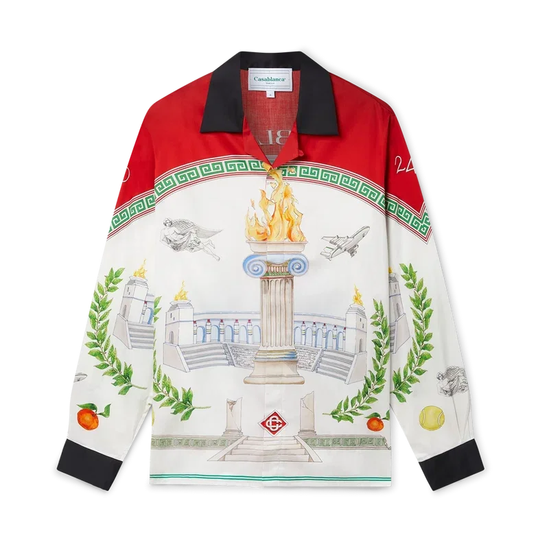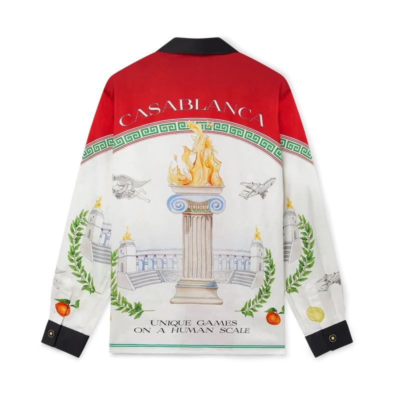 La camisa de algodón Unique Games es un diseño estampado integral de manga larga confeccionado en tejido de algodón con el diseño de temporada de la casa inspirado en la Antigua Grecia. Se completa con los botones esmaltados con borde dorado característicos de la casa, cierre de botones, cuello cubano, cuello y puños en contraste, y detalle de rayas en el dobladillo, con detalle de onda griega en el pecho y la espalda.