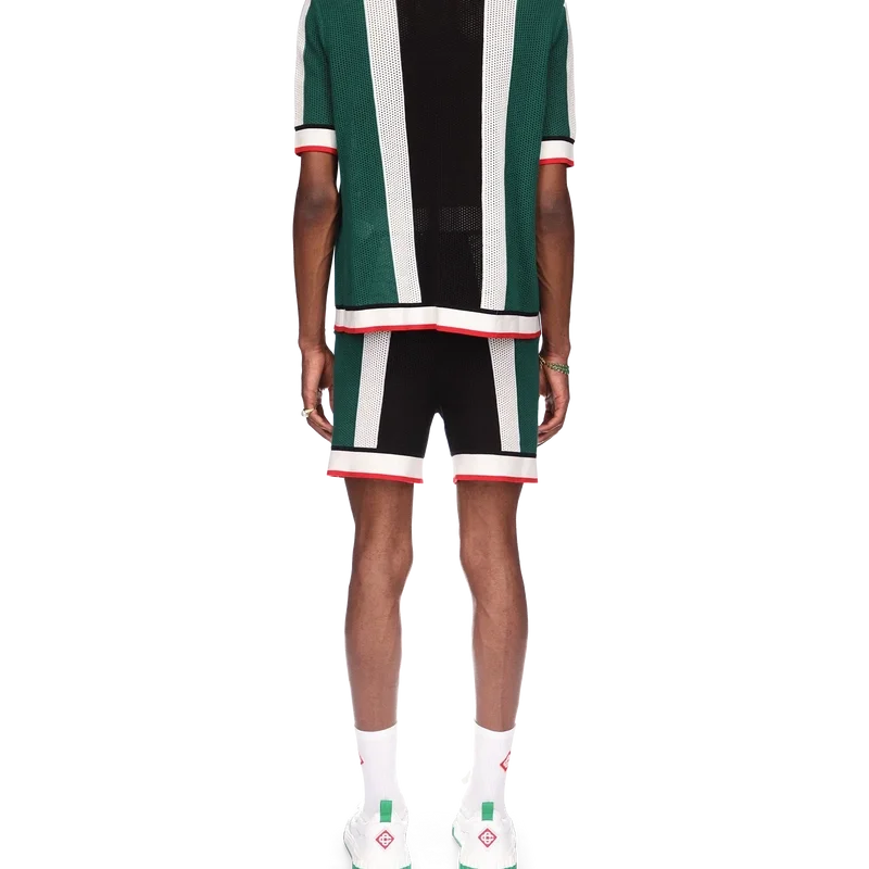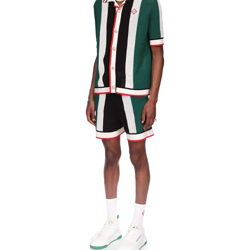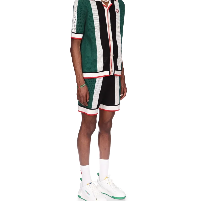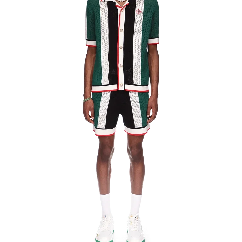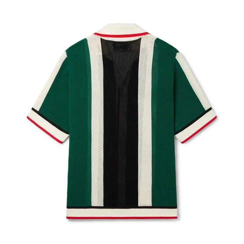 La camisa de malla a rayas es un modelo de manga corta inspirado en los colores de la bandera de Nigeria, confeccionado en tejido de algodón orgánico de punto y adornado con el parche con el logotipo del diamante de la casa. Se completa con cuello, puños, tapeta, dobladillo y cierre de botones acanalados, además de los característicos botones de perla con borde dorado.