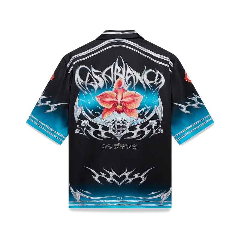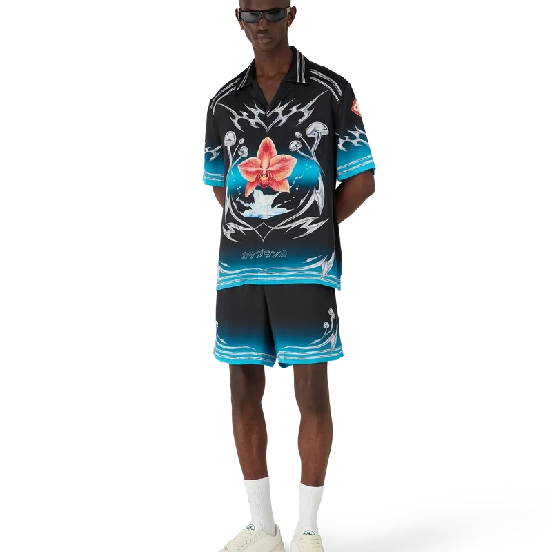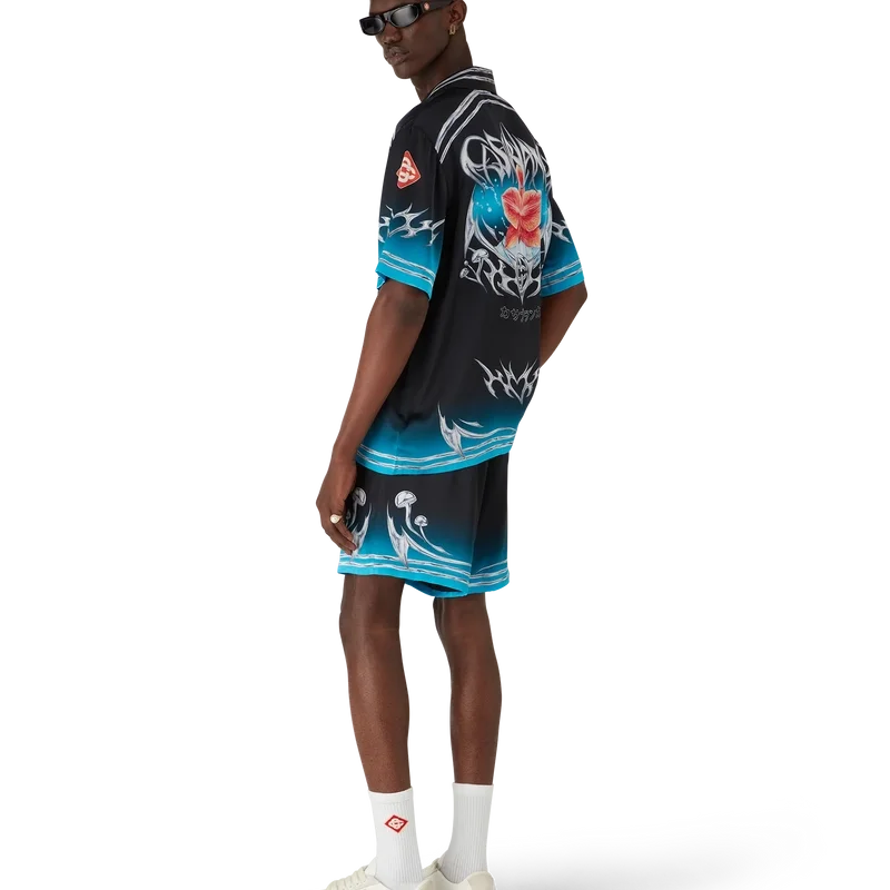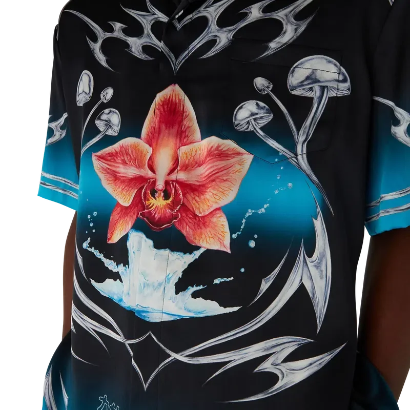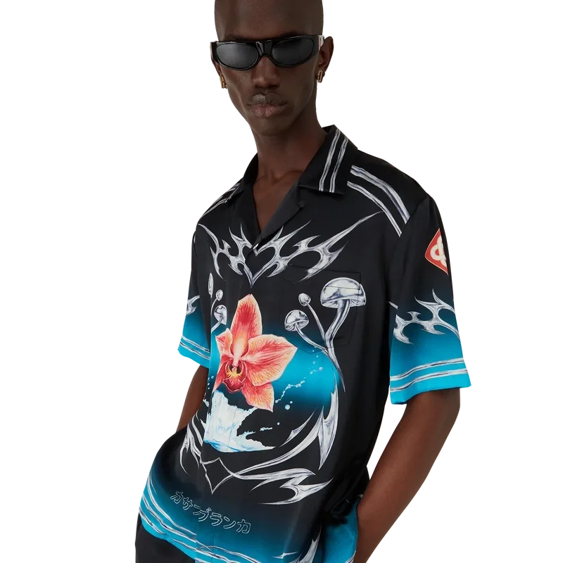 La camisa de manga corta de satén de seda Blades presenta un diseño estampado con ilustraciones que juegan con el contraste entre dos sensaciones opuestas: la nitidez de la hoja y el frío cromo plateado, en contraste con la calidez de la naturaleza, como los tonos rosa y rojo intensos de una flor de orquídea. La incorporación del agua aporta un elemento fresco y nítido al diseño. Se completa con cuello cubano, bolsillo en el pecho, cierre con botones y los característicos botones de corozo con las letras Cc entrelazadas.