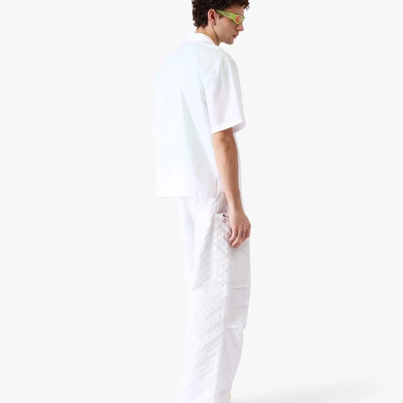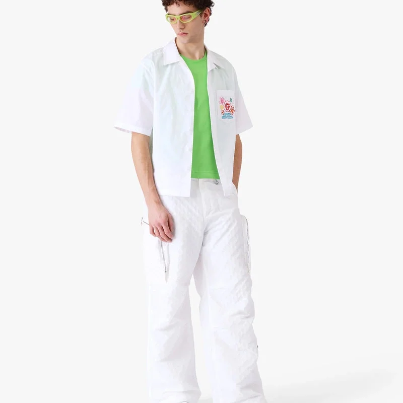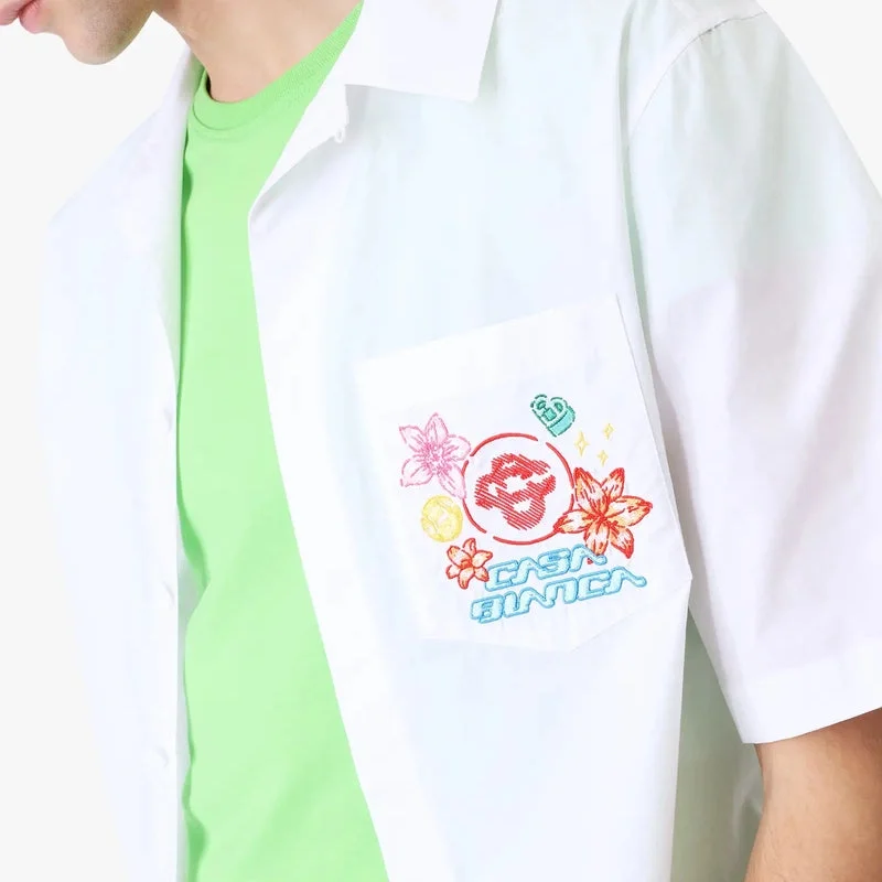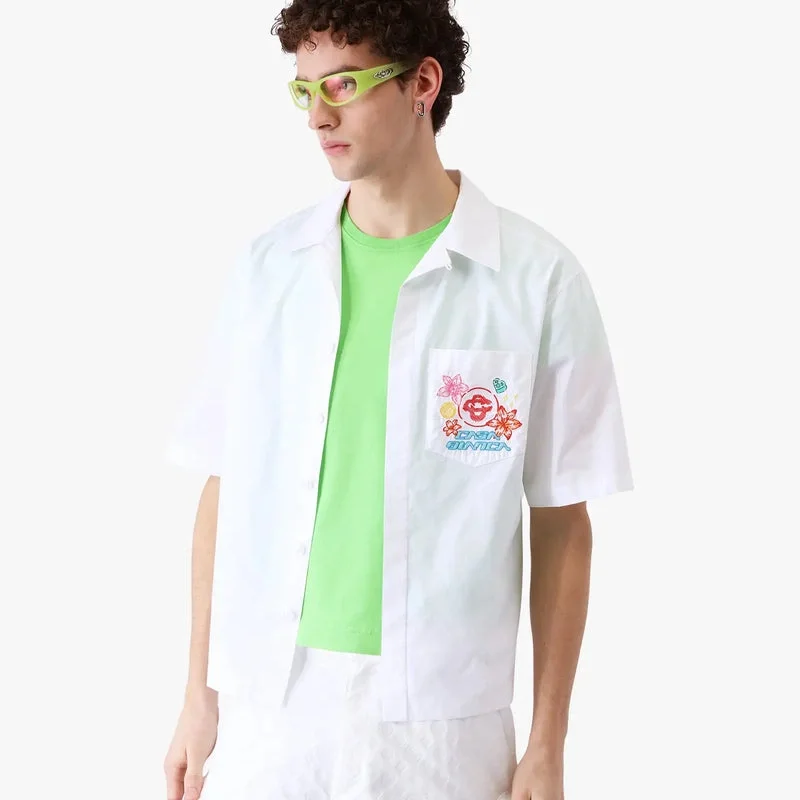 La camisa de manga corta con bordado Collage D’icones Graphiques presenta un diseño refinado con ilustraciones que representan la iconografía y los elementos de diseño de la nueva temporada, incluyendo interpretaciones del logotipo, la sonrisa CC y la flor de orquídea. Se completa con cuello, cierre de botones y bolsillo en el pecho.