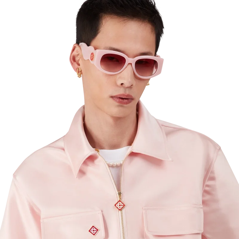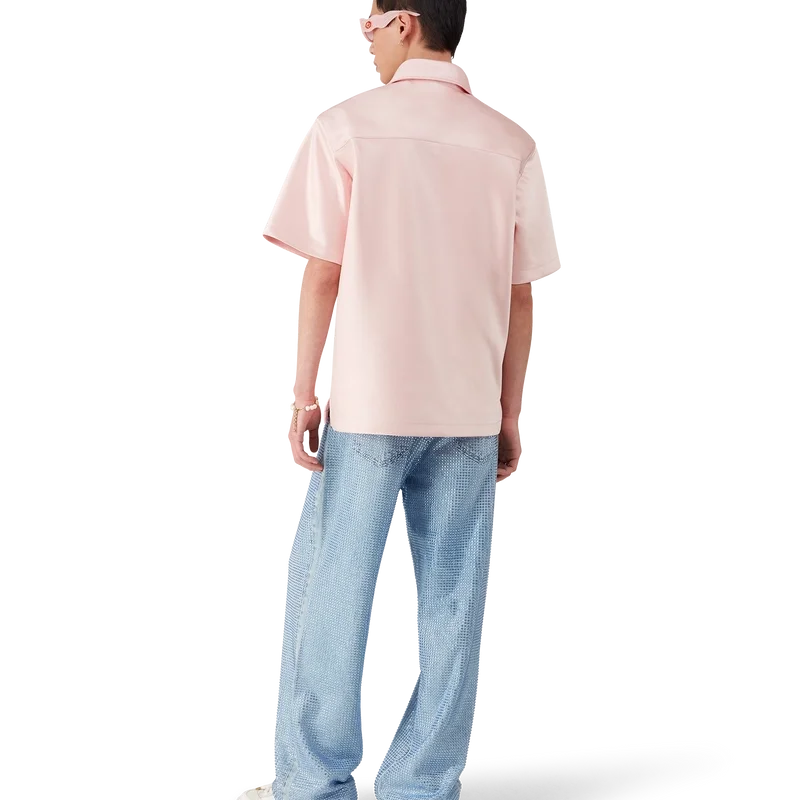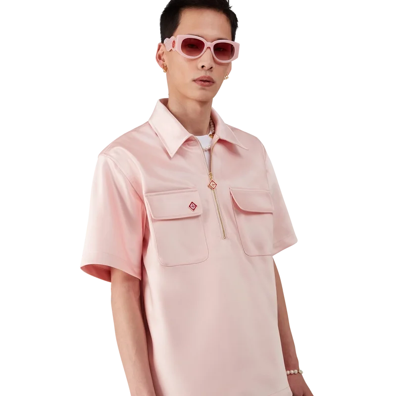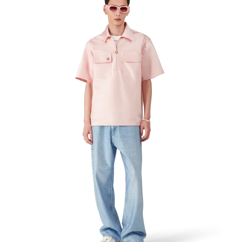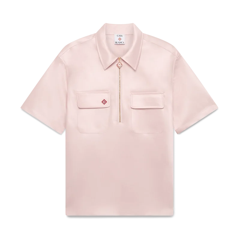 La camisa de satén con cremallera de un cuarto es un diseño de manga corta confeccionado en tejido de satén. Cuenta con un cierre de cremallera con el emblemático logotipo de diamante de la casa, un cuello y bolsillos de parche con solapa.