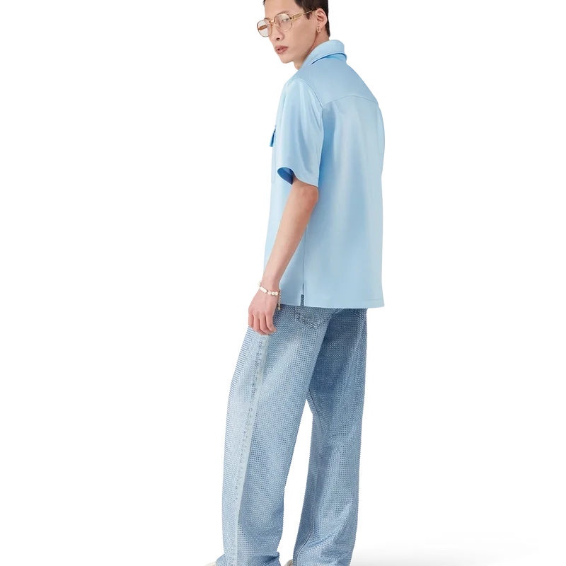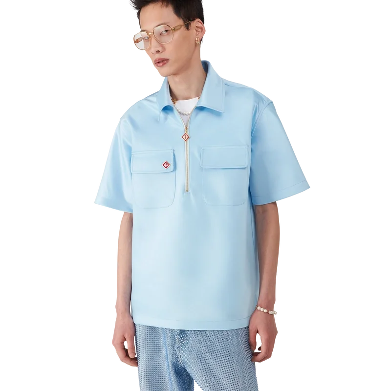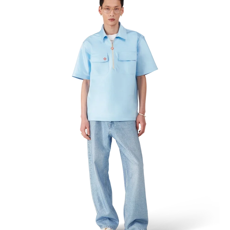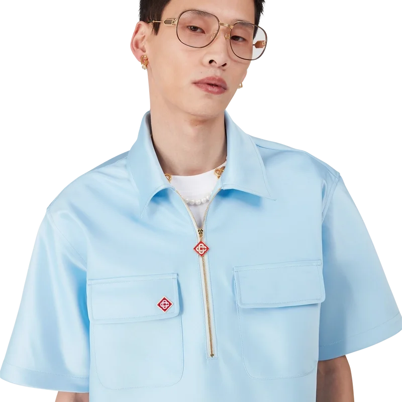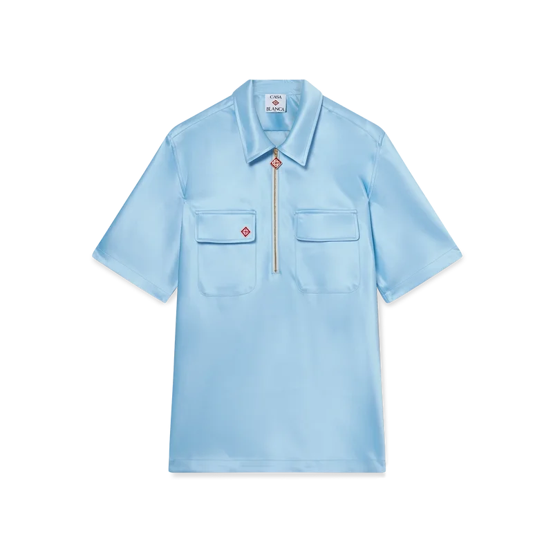 La camisa de satén con cremallera de un cuarto es un diseño de manga corta confeccionado en tejido de satén. Se completa con un cierre de cremallera con el logotipo del diamante característico de la casa, un cuello, aberturas laterales y bolsillos con solapa.