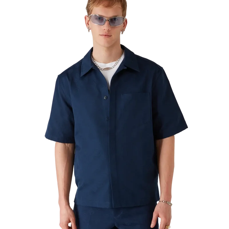 La camisa de manga corta con monograma azul marino presenta un diseño refinado con el icónico estampado de monograma de la casa. Cuenta con cuello en punta, bolsillo de parche delantero, cierre con botones, botones de corozo con el logotipo CC entrelazado y dobladillo asimétrico.5 cm/6’2 y lleva una talla M
