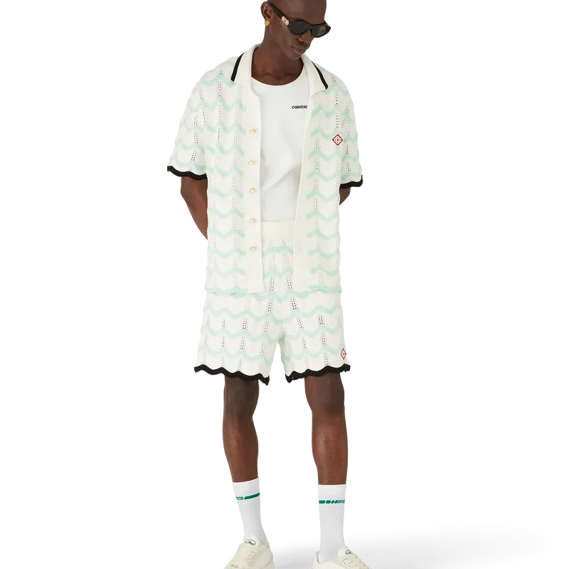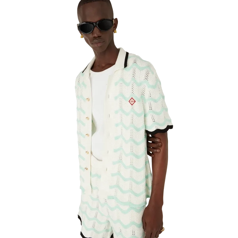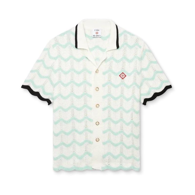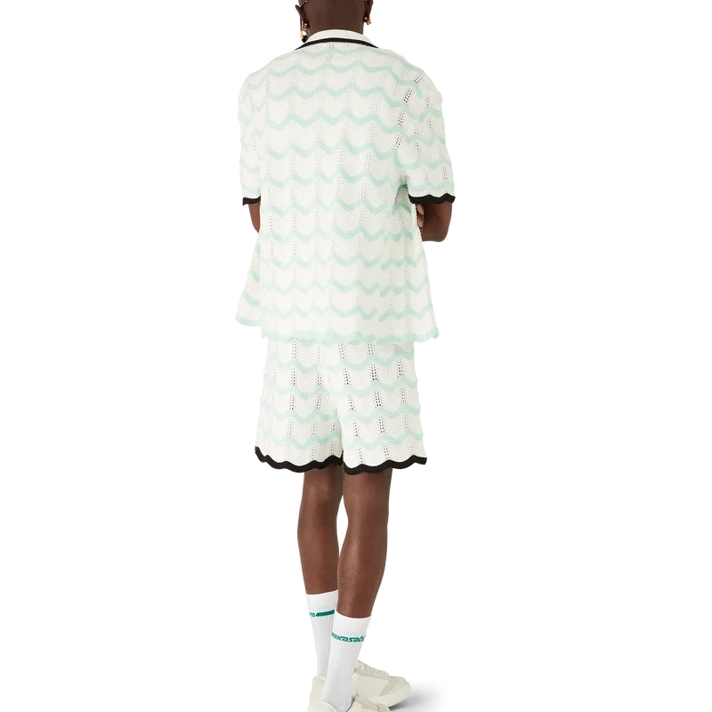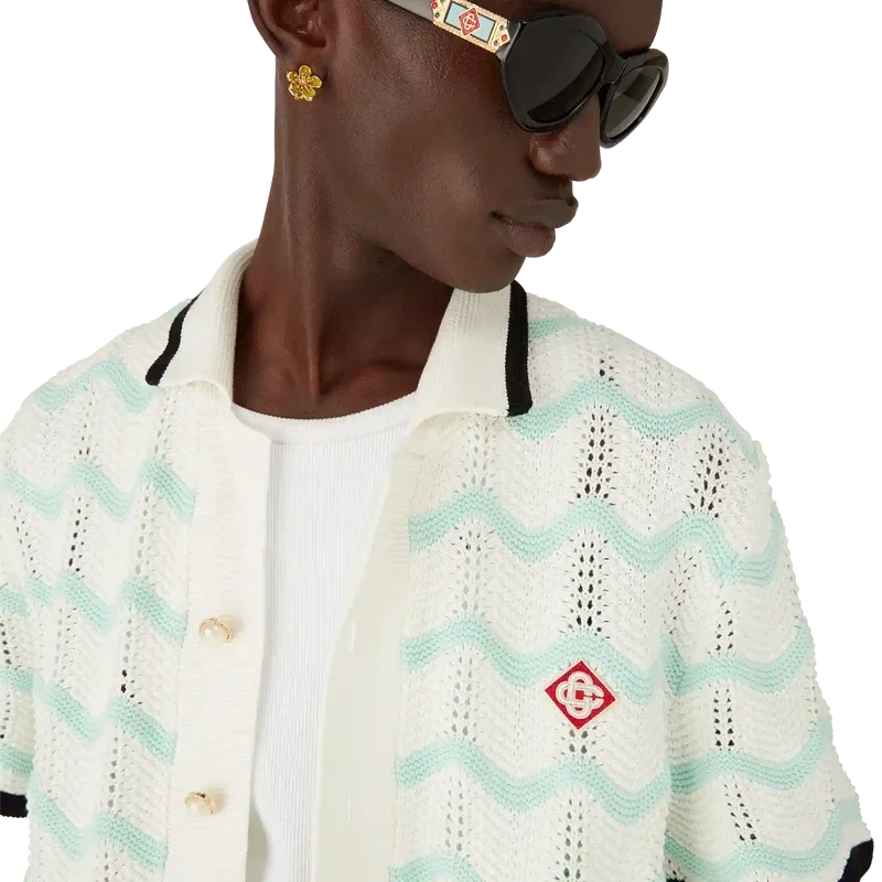 La camisa de pantalón corto de algodón de ganchillo con diseño ondulado degradado es un diseño de punto que presenta el logotipo de diamante característico de la casa. Se completa con cuello, puños y tapeta acanalados en contraste negro, cierre de botones, botones de perla con borde dorado característicos y detalles de bordes ondulados en los puños y el dobladillo.