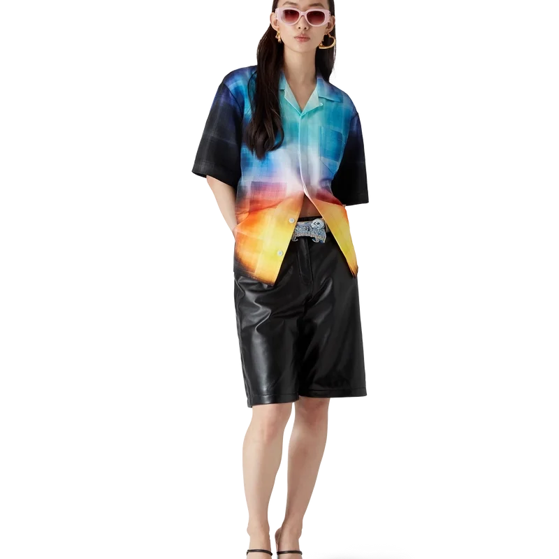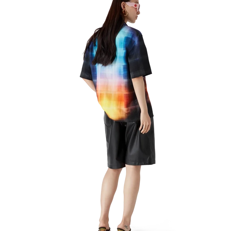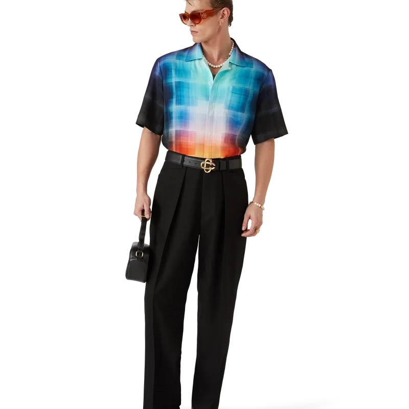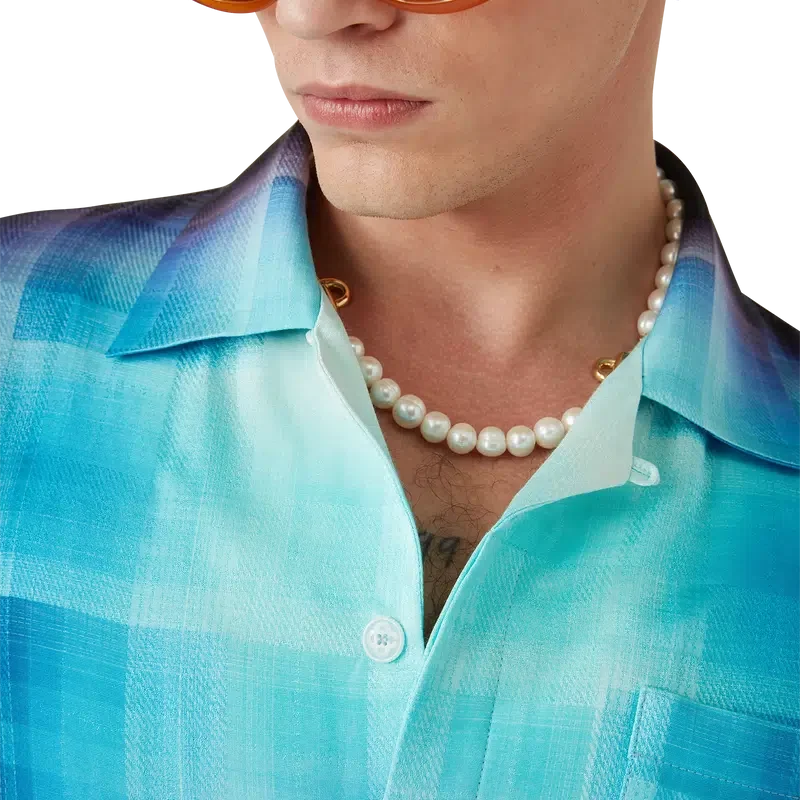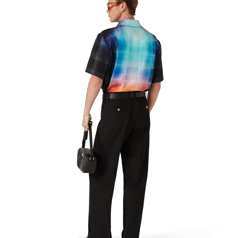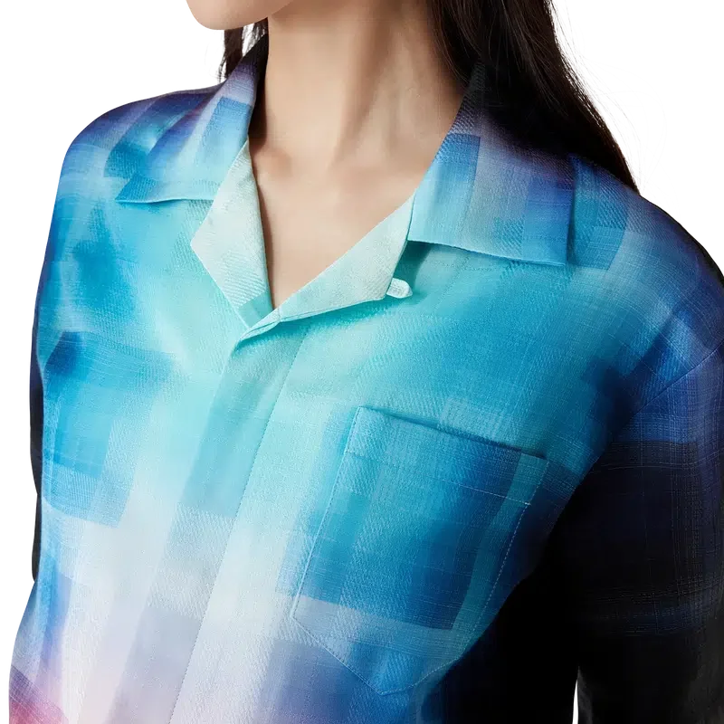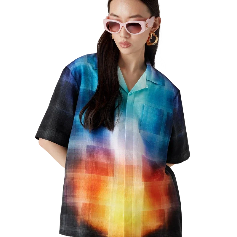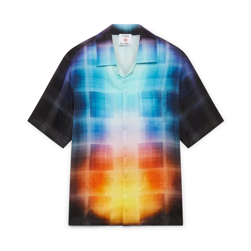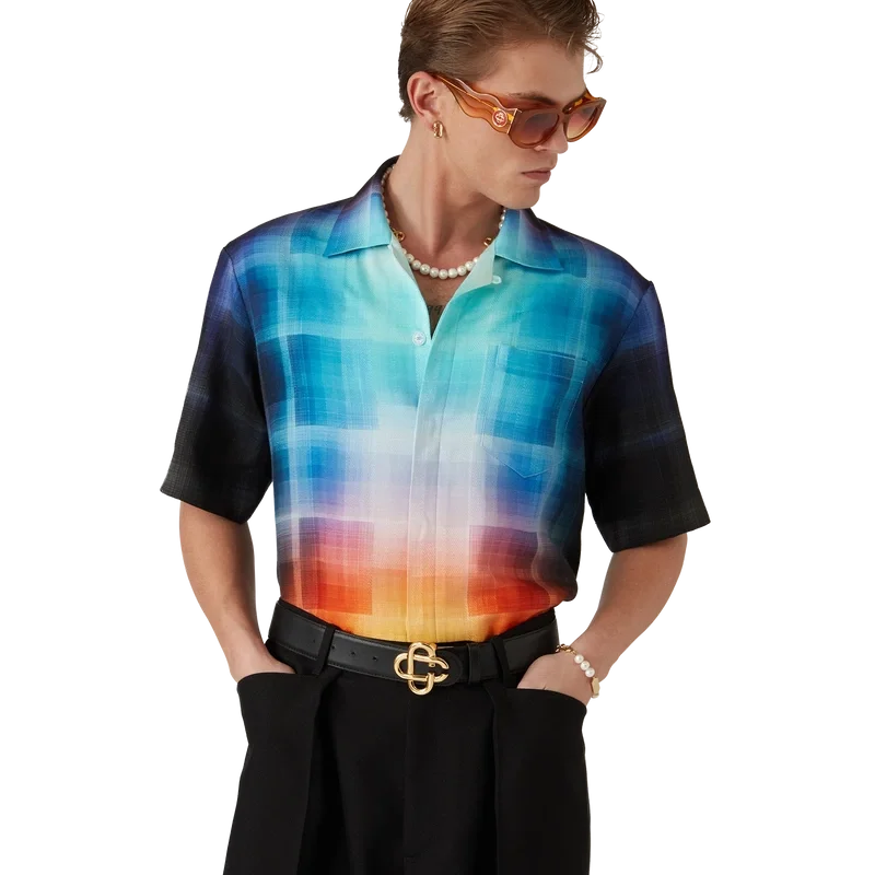 La camisa de cuadros degradados presenta un diseño estampado con los colores degradados de la temporada, confeccionada en tejido de mezcla de algodón con un patrón de cuadros. Se completa con cuello cubano, bolsillo en el pecho, cierre de botones ocultos y botones de corozo con el logotipo Cc entrelazado.