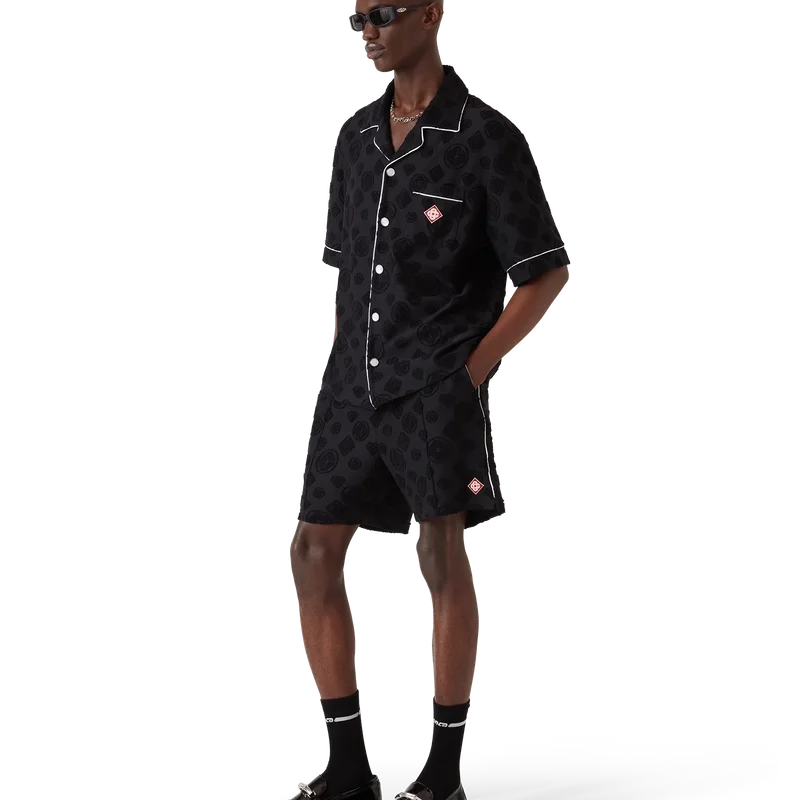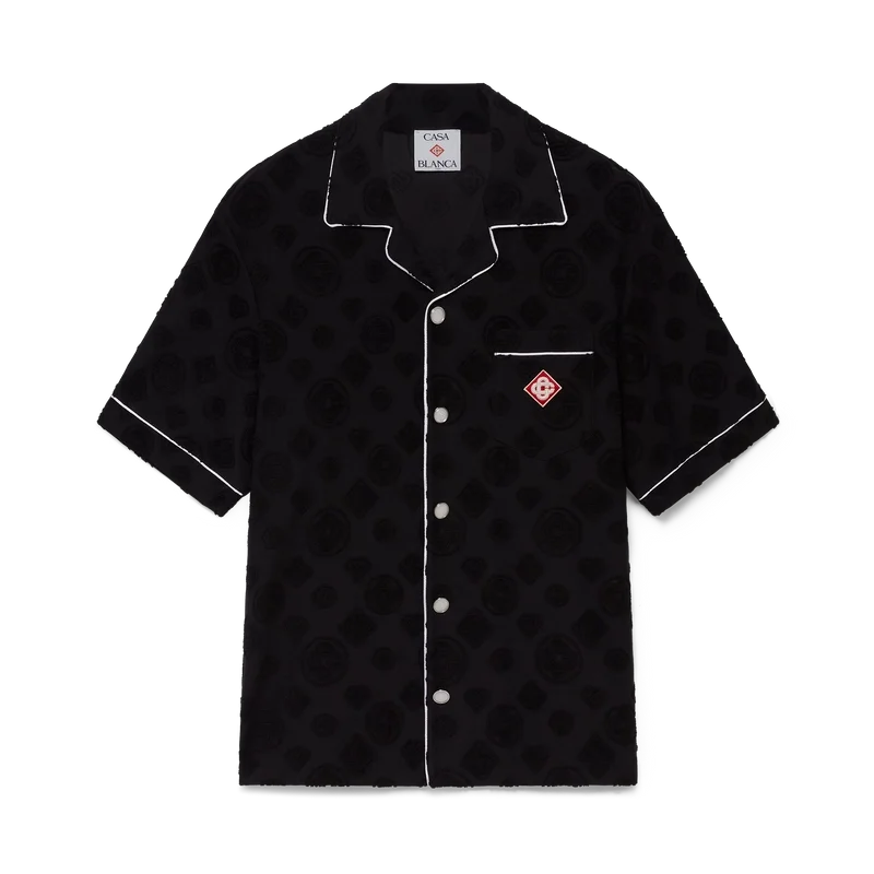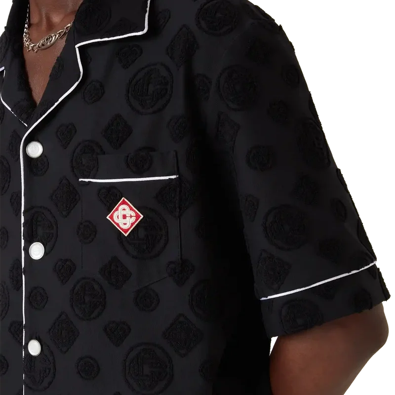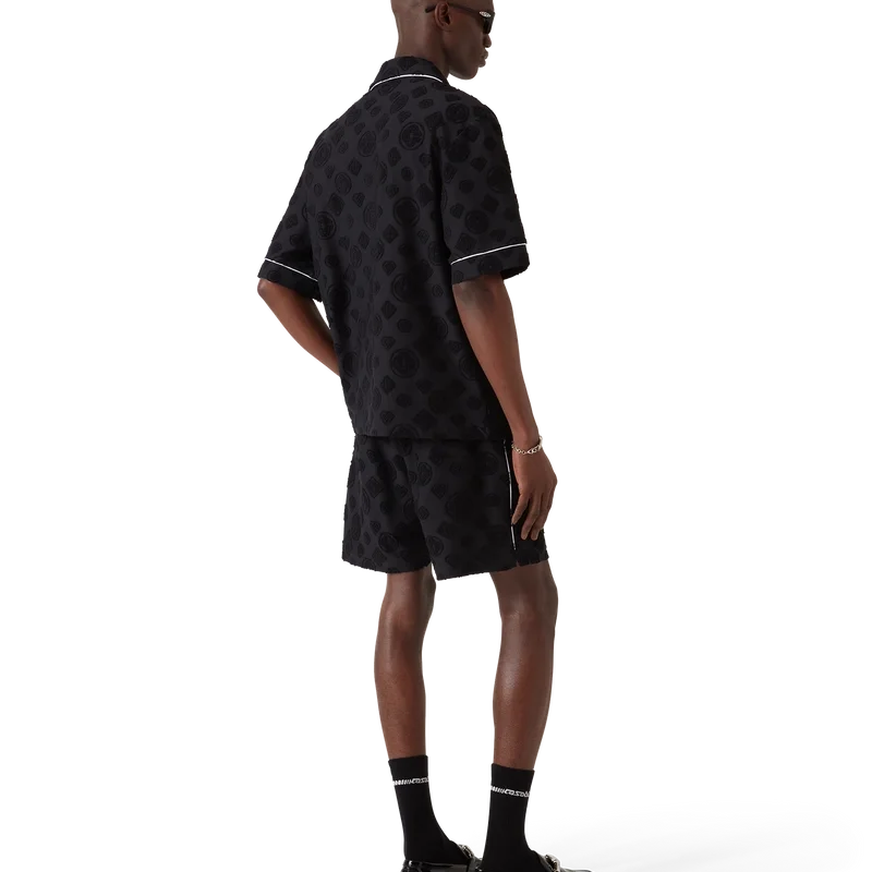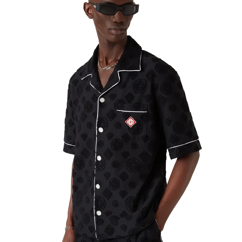 La camisa de manga corta de rizo Monogram es un diseño que presenta el estampado Diamond Monogram característico de la casa. Se completa con un bolsillo en el pecho, ribetes en contraste, botones de perla con borde dorado característicos y un cuello cubano.