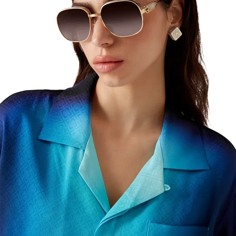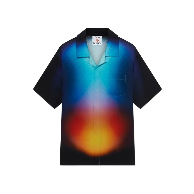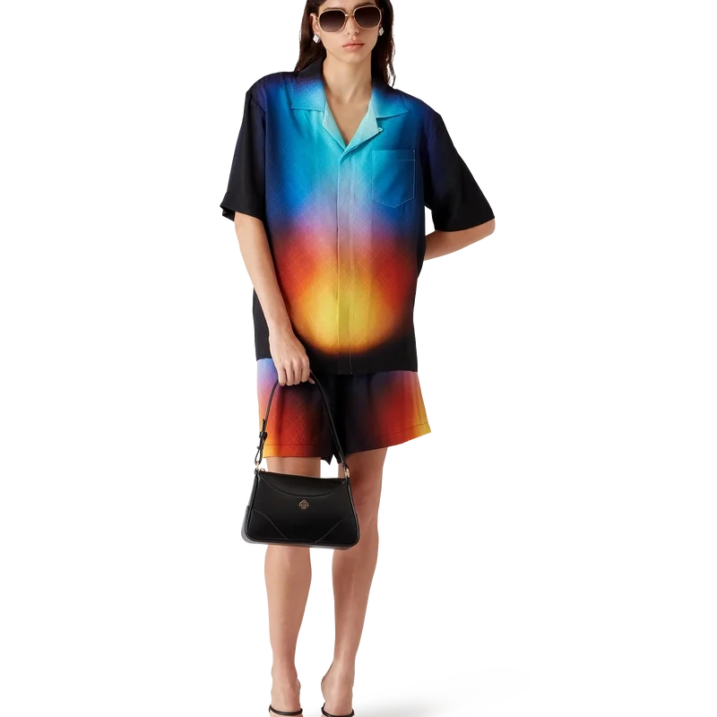 La camisa de seda degradada es un diseño estampado con los colores degradados de la temporada, confeccionada en tejido de seda. Cuenta con cuello cubano, bolsillo en el pecho, cierre con botones ocultos y botones de corozo con el logotipo CC entrelazado. Diseñada para llevarse con los pantalones cortos de seda degradados a juego.