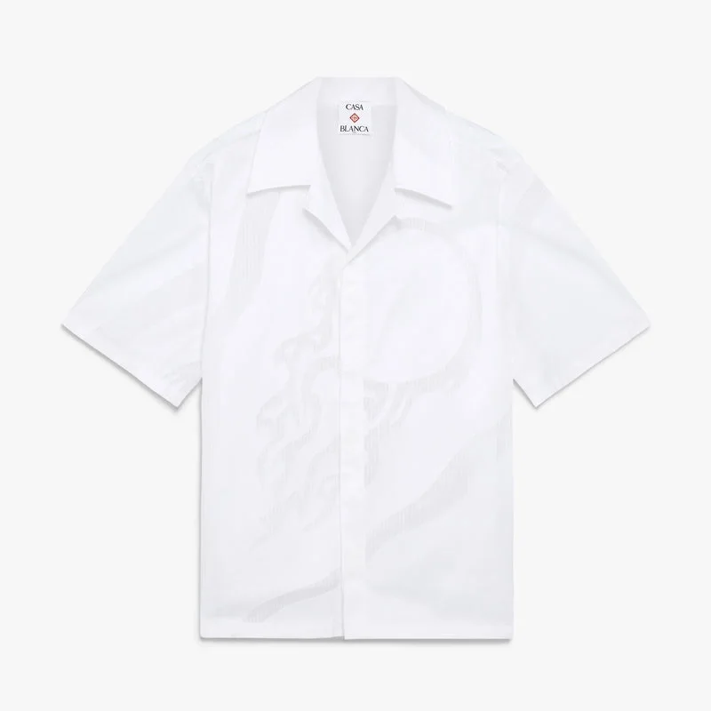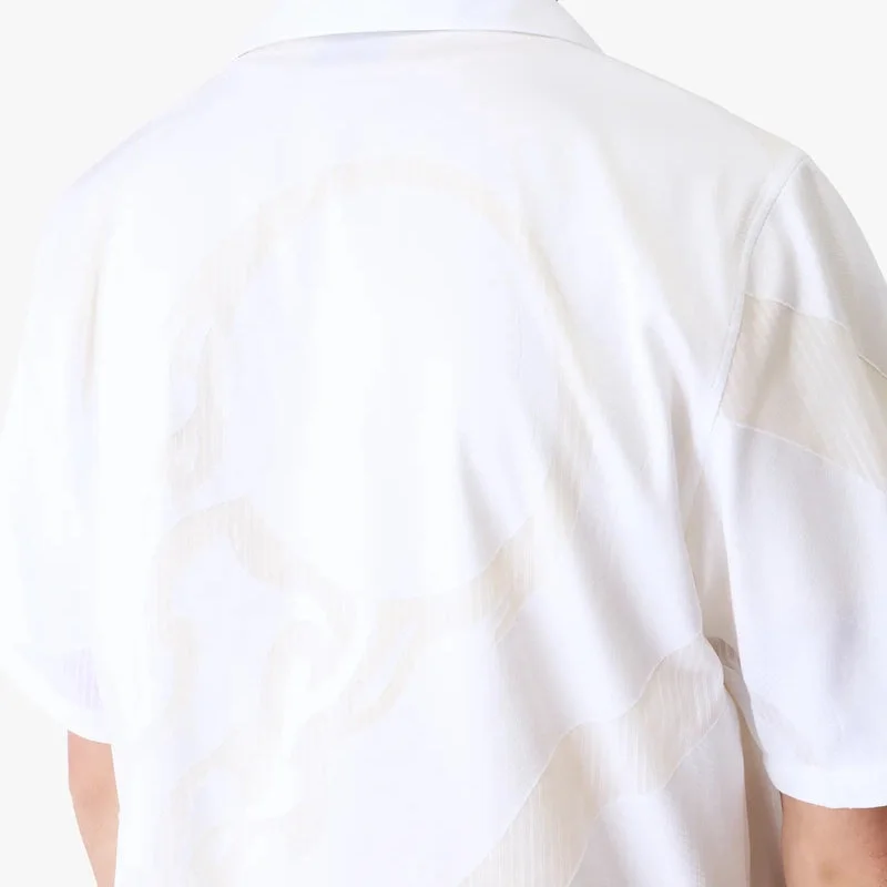 La camisa de manga corta Fil Coupe de The Art of the Serve es un diseño refinado confeccionado en tela de camisa, que presenta una interpretación gráfica del logotipo de la marca, una pelota de tenis en vuelo, que representa el equilibrio fundamental entre potencia, velocidad y control. Se completa con cuello, cierre de botones, botones de corozo con el logotipo CC entrelazado y un bolsillo en el pecho.